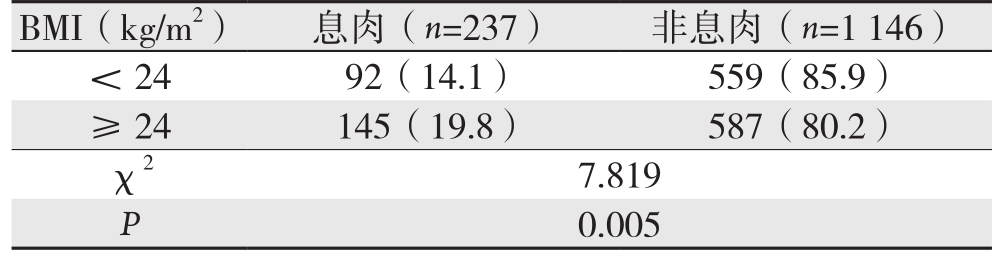 1719例体检者中选取B M I资料完整者1 3 8 3例进行分析,其中非肥胖(B M I<2 4)651例,超重(24≤BMI<28)558例,肥胖组(BMI≥28)174例。BMI<24组结直肠息肉检出人数92例,阳性检出率14.1%(92/651);2 4≤B M I<2 8组检出人数1 0 6例,阳性检出率19.0%(106/558);BMI≥28组阳性检出人数39例,阳性检出率22.4%(39/174)。不同BMI组两两比较(α'=0.0125)发现BMI<24组结直肠息肉检出率低于BMI≥28组,差异有统计学意义(P=0.0125),其余各组间差异无统计学意义(表3)。按BMI<24和≥24分组,发现BMI<24组结直肠息肉检出率为14.1%(92/651),明显低于BMI≥24组的19.8%(145/732),差异有统计学意义(P<0.05)(表4)。