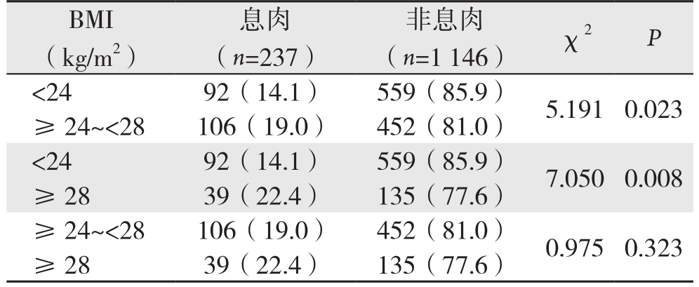 表3 不同BMI组结直肠息肉检出率的两两比较[n(%)]