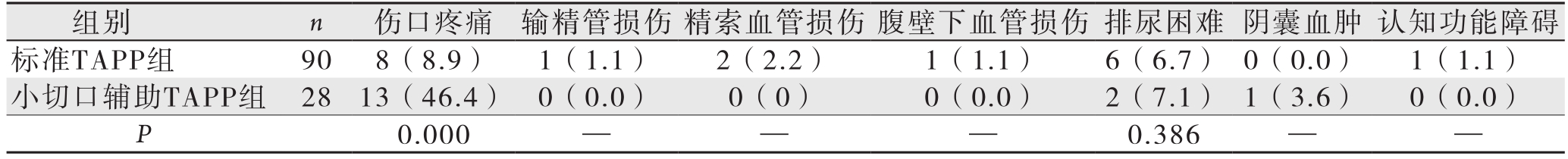 组别 n 伤口疼痛 输精管损伤 精索血管损伤 腹壁下血管损伤 排尿困难 阴囊血肿 认知功能障碍标准TAPP组 90 8(8.9) 1(1.1) 2(2.2) 1(1.1) 6(6.7) 0(0.0) 1(1.1)小切口辅助TAPP组 28 13(46.4) 0(0.0) 0(0) 0(0.0) 2(7.1) 1(3.6) 0(0.0)P 0.000— — —0.386— —