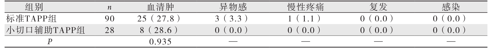 表3 标准TAPP患者与小切口辅助TAPP患者随访期并发症比较[n(%)]