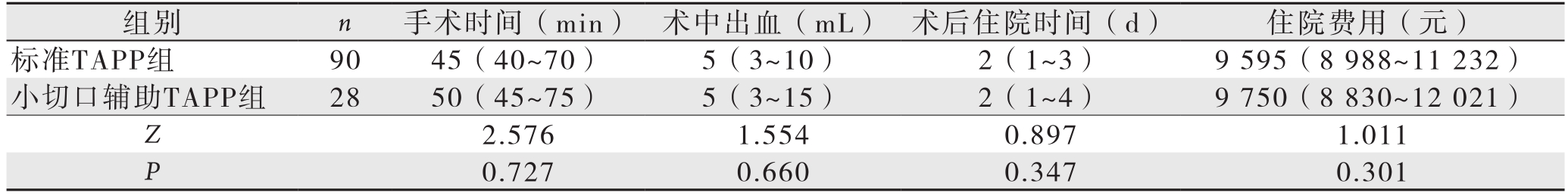 表1 标准TAPP患者与小切口辅助TAPP患者手术相关指标比较[M(Q1~Q3)]