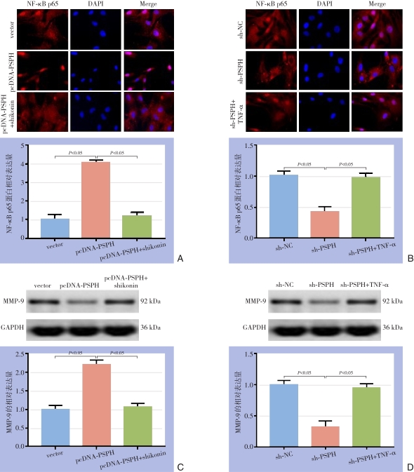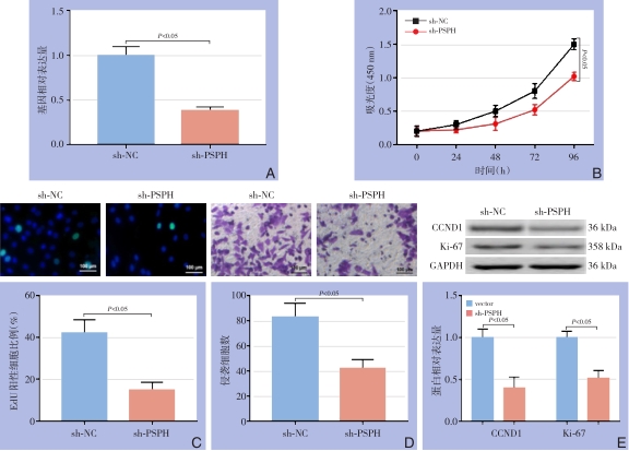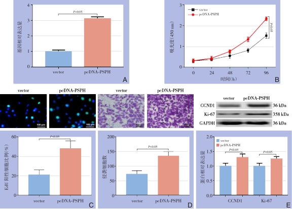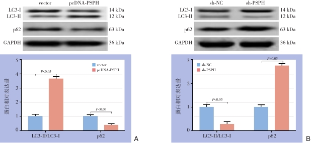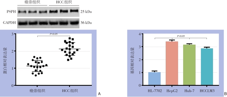 Abstract:Background and Aims Phosphoserine phosphorylase (PSPH) has been reported to be upregulated in multiple types of cancer and have a promoting effect on tumor growth and metastasis. However, its exact role in hepatocellular carcinoma (HCC) is largely unknown. Therefore, this study was conducted to investigate the expression and action of PSPH in HCC, and to explore the potential mechanism.Methods The expressions of PSPH in HCC and adjacent tissue as well as in different HCC cell lines (HepG2, Huh-7, HCCLM3) and normal hepatic cell line (HL-7702) were detected by Western blot and qRT-PCR, respectively. In HepG2 after overexpression or knock down of PSPH, the changes in proliferation and invasion abilities, and the expressions of proliferation markers CCND1 and Ki-67 were determined by CCK-8, EdU and Transwell invasion assays and Western blot, respectively. Meanwhile, the expressions of autophagy-related proteins LC3-II/LC3-I and p62 as well as invasion-associated protein MMP-9, and nuclear translocation of the p65 submit were detected by Western blot and immunofluorescence staining, respectively.Results The PSPH protein expression was significantly up-regulated in HCC tissue compared with adjacent tissue, and the PSPH gene expressions were significantly increased in each HCC cell line compared with normal hepatic cells (all P<0.05). In HepG2 cells after PSPH overexpression, the proliferation and invasion abilities were significantly enhanced, and the expressions of CCND1 and Ki-67 proteins were significantly up-regulated, with increased LC3-II/LC3-I expression and decreased p62 expression as well as enhanced p65 nuclear translocation and up-regulated MMP-9 expression (all P<0.05); in HepG2 cells after PSPH knockdown, the totally opposite changes in these parameters were observed (all P<0.05). The effects of p65 nuclear translocation promotion and MMP-9 up-regulation by PSPH overexpression were inhibited by NF-κB pathway inhibitor shikonin, and the effects of p65 nuclear translocation inhibition and MMP-9 down-regulation by PSPH knockdown were reversed by NF-κB pathway agonist TNF-α (all P<0.05).Conclusion PSPH expression is increased in HCC and high PSPH expression can strengthen the proliferation and metastasis abilities of HCC cells. The action mechanism may be probably associated with its suppressing autophagy and activating NF-κB/MMP-9 signaling pathway.