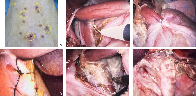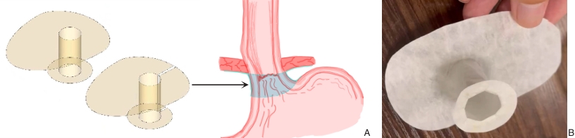 Abstract:Background and Aims Laparoscopic hiatal hernia repair (LHHR) is the gold-standard surgical treatment for hiatal hernia (HH), but postoperative recurrence remains a challenge due to hiatal enlargement and disruption of the phrenoesophageal ligament. This study aimed to assess the feasibility, safety, and short-term efficacy of a novel three-dimensional small intestinal submucosa (3D-SIS) patch designed for circumferential crural reinforcement and ligament-like reconstruction in a porcine LHHR model.Methods Twelve healthy pigs (35-40 kg) were equally randomized into non-mesh group, SIS flat patch group, and 3D-SIS patch group. All animals underwent LHHR and Nissen fundoplication under general anesthesia. In the non-mesh group, the hiatal defect was closed with interrupted sutures. In the SIS flat patch group, a U-shaped SIS patch was placed posterior to the esophagus to reinforce the crura and fixed with medical glue. In the 3D-SIS patch group, an intraoperatively assembled three-dimensional patch was applied, consisting of an upper keyhole-shaped layer for circumferential diaphragmatic reinforcement, a tubular middle part encircling the abdominal esophagus, and a lower small keyhole-shaped patch covering the gastroesophageal junction, all fixed with medical glue. After 3 months, laparotomy was performed to assess recurrence, patch integration, and complications, followed by biomechanical and histological evaluations.Results All procedures were completed successfully with no deaths or major complications. Operative time was slightly longer in the patch groups, while blood loss was similar. No hernia recurrence or patch migration was observed at 3 months. Biomechanical testing revealed higher ultimate load and Young's modulus in both SIS groups than in the non-mesh group. Histological analysis demonstrated neovascularization and collagen deposition in the patch groups, with the 3D-SIS patch showing more complete circumferential integration and ligament-like tissue formation.Conclusion The 3D-SIS patch is feasible and safe in porcine LHHR. It provides circumferential diaphragmatic reinforcement and promotes phrenoesophageal ligament-like regeneration, offering a new concept for reducing postoperative recurrence and reconstructing the anti-reflux barrier.
