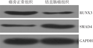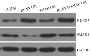 Abstract:Background and Aims The transforming growth factor β (TGF-β)/SMAD4 signaling pathway plays an important role in the occurrence and development of colorectal cancer. The expression of runt-related transcription factor 3 (RUNX3) was found to be remarkably decreased in colorectal tissues and it may exert tumor-suppressing effects. However, the relationship between the actions of RUNX3 and TGF-β/SMAD4 pathway has not yet been reported. Therefore, this study was conducted to investigate the expressions and effects of RUNX3 and SMAD4 in colorectal cancer tissue, and their mutual relationship.Methods A total of 98 paired samples of colorectal tissue and adjacent normal tissue were collected. The protein expressions of RUNX3 and SMAD4 were detected by Western blot, and the mRNA expression of SMAD4 was detected by qRT-PCR, respectively. The correlation between RUNX3 and SMAD4 expressions were analyzed. Human colorectal cancer SW480 cells were transfected with RUNX3 overexpression plasmid (RUNX3 group), SMAD4 overexpression plasmid (SMAD4 group) and RUNX3 and SMAD4 overexpression plasmid (RUNX3+SMAD4 group) respectively, using SW480 cells transfected with negative control plasmid as control group. In each group of cells, the changes in RUNX3 and SMAD4 expressions were determined by Western blot and qRT-PCR, and the differences in proliferative and invasion abilities were examined by CCK-8 assay and Transwell assay, respectively.Results The protein expression level of RUNX3 in colorectal cancer tissue was significantly lower than that in adjacent normal tissue, and the mRNA and protein expression levels of SMAD4 were significantly higher in colorectal cancer tissue than those in adjacent normal tissue (all P<0.05); RUNX3 protein expression was negatively correlated with SMAD4 mRNA and protein expressions in colorectal cancer tissue (r=0.511, P=0.004; r=0.487, P=0.009). Compared with control group, the RUNX3 protein expression was significantly increased, while the mRNA and protein expressions of SMAD4 were significantly decreased in the RUNX3 group (all P<0.05); the RUNX3 protein expression showed no significant change (P>0.05), while the mRNA and protein expressions SMAD4 were significantly increased in SMAD4 group (all P<0.05); the RUNX3 protein expression was significantly increased (P<0.05), while the mRNA and protein expressions SMAD4 showed no significant changes in RUNX3+SMAD4 group (both P>0.05). The cell proliferation and invasion abilities were significantly lower in RUNX3 group and were significantly higher in SMAD4 group than those in control group (all P<0.05); both cell proliferation and invasion abilities in RUNX3+SMAD4 represented an intermediate state between RUNX3 group and SMAD4 group, which showed no significant differences with control group (both P>0.05).Conclusion The expression of RUNX3 is down-regulated in colorectal cancer tissue. RUNX3 up-regulation can suppress the malignant biological behavior of colorectal cancer cells, and the mechanism may be associated with its inhibiting the activity of the TGF-β/SMAD4 signaling pathway.