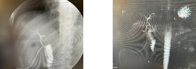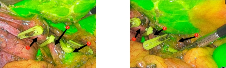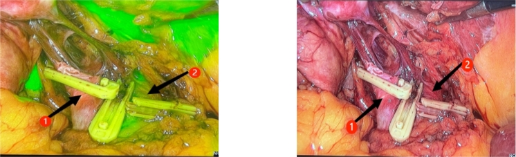 Abstract:Background and Aims Mirizzi syndrome (MS) is a rare complication of cholecystitis and chronic cholelithiasis. With the development of minimally invasive techniques, laparoscopic cholecystectomy (LC) is increasingly being used for the treatment of type I MS, in which, the intraoperative biliary tract injury is still the most serious complication. At present, indocyanine green (ICG) fluorescent navigation technique is more and more widely being used in the clinical practice of laparoscopic hepatobiliary surgery. This technique can well display the drainage area of the hepatic portal vein and play an important role in anatomical liver resection. During metabolism, ICG is taken up by hepatocytes and excreted into bile and thereby delivered into the duodenum through the biliary tract, which can guide and trace the anatomical structure of the entire biliary tract system. Therefore, this study was performed to investigate the efficacy of ICG in identification and navigation of biliary tract during LC for type I MS.Methods The clinical data of 67 patients with type I MS undergoing LC in the Second Affiliated Hospital of Kunming Medical University from October 2019 to January 2022 were retrospectively analyzed. Of the patients, 35 cases underwent LC under the guidance of intraoperative fluorescence navigation using ICG (fluorescence navigation group), and 32 cases underwent conventional LC (conventional surgery group). The main clinical variables were compared between the two groups of patients.Results There were no significant differences in preoperative data and laboratory measurements between the two groups of patients (all P>0.05). In fluorescence navigation group compared with conventional surgery group, the mean operative time (74.66 min vs. 93.03 min), mean intraoperative blood loss (20.43 mL vs. 57.34 mL) and open conversion rate (0 vs. 12.5%) were significantly reduced; the average drainage volume on postoperative day 1 (25.43 mL vs. 36.63 mL), average time to tube removal (1.29 d vs. 1.91 d), average length of postoperative hospital stay (2.8 d vs. 3.66 d) and average total hospitalization cost (11 349.43 yuan vs. 12 907.41 yuan) were significantly decreased (all P<0.05). After operation, abdominal wound infection occurred in 2 cases in fluorescence navigation group, while biliary tract injury occurred in 2 cases, bile leakage occurred in 2 cases, and abdominal wound infection occurred in 4 cases in conventional surgery group. The overall incidence rate of postoperative complications in fluorescence navigation group was significantly lower than that in conventional surgery group (5.7% vs. 25.0%, P=0.039).Conclusion ICG fluorescent navigation can display biliary tract system in real time, reduce intraoperative bleeding, operative time, conversion to open surgery and incidence of complications, and prevent biliary tract injury.