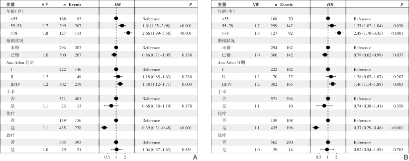 Abstract:Background and Aims Primary hepatic diffuse large B-cell lymphoma (DLBCL) is rare and carries a poor prognosis, with no large-scale evidence supporting the value of chemotherapy. This study used real-world, large-sample data from the SEER database to evaluate the prognostic impact of chemotherapy in patients with primary hepatic DLBCL.Methods Clinical data of patients pathologically diagnosed with primary hepatic DLBCL between 2000 and 2019 were extracted from the SEER database and grouped according to whether they received chemotherapy. Kaplan–Meier survival analysis, Cox proportional hazards models, and random survival forest models were employed to identify factors influencing overall survival (OS) and cancer-specific survival (CSS), and subgroup analyses were performed.Results A total of 594 patients were included, with a median age of 66 years; 435 (73.2%) received chemotherapy. After a median follow-up of 17.5 months, the median OS was 81 (7-173) months in the chemotherapy group versus 11 (2-171) months in the non-chemotherapy group. The OS and CSS rates in the chemotherapy group were significantly higher than those in the non-chemotherapy group (67.99% vs. 47.77%; 71.03% vs. 52.87%, both P<0.05). Multivariate analysis showed that chemotherapy was an independent protective factor for OS (HR=0.39, 95% CI=0.31-0.48) and CSS (HR=0.37, 95% CI=0.29-0.48). In the random survival forest model, chemotherapy ranked highest in variable importance. Subgroup analyses produced consistent results.Conclusion Chemotherapy is an independent prognostic factor for patients with primary hepatic DLBCL and can significantly improve survival. The R-CHOP regimen may be the preferred therapeutic option.