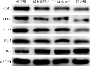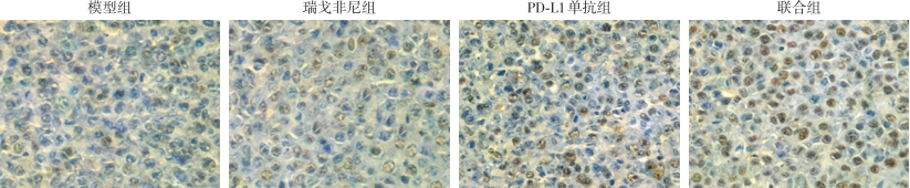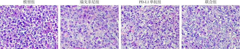 Abstract:Background and Aims Regorafenib treatment for liver cancer inevitably presents side effects and limited efficacy. Programmed death-ligand 1 (PD-L1) monoclonal antibody can effectively block the "tumor immune escape mechanism" and exert significant anti-tumor effects. Therefore, this study was conducted to explore the anti-cancer effect of regorafenib combined with PD-L1 monoclonal antibody in a mouse model of transplanted liver cancer.Methods After establishing a liver cancer transplant model in Balb/C nude mice, the mice were treated with regorafenib (regorafenib group), atezolizumab (PD-L1 antibody group), regorafenib + atezolizumab (combination group), or saline (model group) for 4 weeks. Tumor volumes were dynamically measured in each group during the treatment period. After 4 weeks, the transplanted tumors were excised from the mice, and flow cytometry, TUNEL assay, and HE staining were used to detect CD4+ and CD8+ cell infiltration, apoptosis rate, and morphological characteristics of the tumor tissues. Additionally, qRT-PCR and Western blot were employed to detect the expression of CD31, vascular endothelial growth factor (VEGF), proliferating cell nuclear antigen (Ki-67), B-cell lymphoma 2 (Bcl-2), and Bax in the tumor tissues.Results There was no statistically significant difference in tumor volumes among the four groups of mice before treatment (P>0.05). At weeks 1, 2, 3, and 4 of treatment, the tumor volumes in each treated group were significantly smaller than those in the model group, and the tumor volume in the combination group was significantly smaller than those in the two monotherapy groups (all P<0.05). However, there was no significant difference in tumor volume between the two monotherapy groups (all P>0.05). The proportion of CD4+ and CD8+ cells in tumor tissues was significantly higher in each treated group than those in the model group, with the increase being in the order of regorafenib group <PD-L1 antibody group < combination group (all P<0.05). The apoptosis rate of tumor cells was significantly higher in each treated group compared to the model group, with the increase being in the order of regorafenib group <PD-L1 antibody group < combination group (all P<0.05). HE staining showed large, deeply stained, densely arranged nuclei in tumor cells of the model group, while various degrees of nuclear shrinkage, reduced cell numbers, and patchy necrosis were observed in the treated groups, with the most pronounced changes in the combination group. Compared to the model group, the expression levels of CD31, VEGF, Ki-67, and Bcl-2 mRNA and protein in tumor tissues were significantly lower in the treated groups. In contrast, the expression levels of Bax mRNA and protein were significantly higher. The extent of these changes was more pronounced in the combination group than in the two monotherapy groups, with no significant difference between the two monotherapy groups (all P>0.05).Conclusion Regorafenib combined with PD-L1 monoclonal antibody can effectively inhibit the growth of liver cancer, and the intensity is greater than that of either treatment alone. This effect may be achieved through the synergistic interaction of their different mechanisms of action.