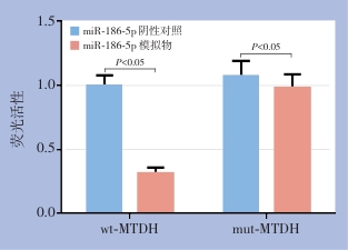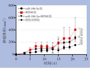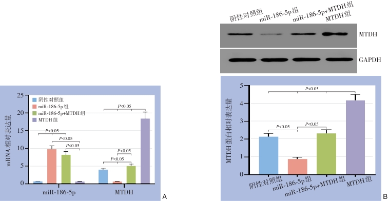 Abstract:Background and Aims Human epidermal growth factor receptor 2 (HER2)-positive breast cancer is characterized by high aggressiveness and poor prognosis. MicroRNAs (miRNAs) play critical roles in tumor progression. miR-186-5p has recently been identified as a tumor-related miRNA, but its function in HER2-positive breast cancer remains unclear. This study aimed to investigate the regulatory relationship between miR-186-5p and metadherin (MTDH) and its effect on tumor growth in a HER2-positive breast cancer xenograft model.Methods The potential binding site between miR-186-5p and MTDH was predicted by TargetScan and verified by dual-luciferase reporter assay. BT-474 cells were transfected with miR-186-5p mimic, MTDH overexpression plasmid, or both. The mRNA and protein levels of miR-186-5p and MTDH were detected. Xenograft models were established by subcutaneous inoculation of transfected cells into nude mice. Tumor volume and weight were measured on day 28, and the expression of miR-186-5p and MTDH in tumor tissues was analyzed.Results Dual-luciferase reporter assay demonstrated that miR-186-5p directly targets the 3'-UTR of MTDH mRNA. Compared with the negative control group, overexpression of miR-186-5p significantly downregulated the mRNA and protein expression of MTDH, whereas MTDH overexpression upregulated its expression and partially reversed the inhibitory effect of miR-186-5p on MTDH (all P<0.05). In vivo, tumor growth rate, volume, and weight were significantly reduced in the miR-186-5p overexpression group but significantly increased in the MTDH overexpression group compared with the negative control group (all P<0.05), while no significant differences were observed in the miR-186-5p + MTDH co-transfection group (all P>0.05). Further in vivo analysis revealed that miR-186-5p expression was markedly increased, whereas MTDH mRNA and protein expression were significantly decreased in xenograft tumors of the miR-186-5p overexpression group; MTDH expression was significantly elevated in the MTDH overexpression group; and no significant difference in MTDH expression was observed between the co-transfection group and the negative control group (all P>0.05). Immunohistochemical findings were consistent with the molecular results.Conclusion miR-186-5p suppresses the growth of HER2-positive breast cancer xenografts by targeting and downregulating MTDH, suggesting that the miR-186-5p/MTDH axis may serve as a potential therapeutic target for HER2-positive breast cancer.