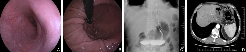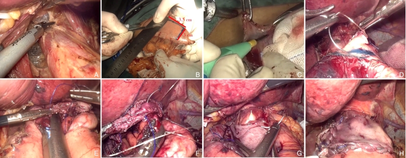 Abstract:Background and Aims In recent years, function-preserving proximal gastrectomy with reconstruction has become an important approach for the treatment of early gastric cancer. However, there is no standardized surgical technique, and the short- and long-term outcomes of various new procedures remain unclear. This study was performed to evaluate the safety and short-term efficacy of laparoscopic proximal gastrectomy plus esophagogastrostomy with single-flap technique for early gastric cancer.Methods The clinical data and follow-up records of 7 patients who underwent laparoscopic proximal gastrectomy with single-flap esophagogastrostomy in the First Affiliated Hospital of Soochow University between December 2021 and December 2022 were retrospectively analyzed. Perioperative safety, postoperative reflux, anastomotic stricture at 6 months, and related nutritional parameters were assessed. The nutrition-related indicators of this group of patients were compared with those of 11 patients who underwent total gastrectomy with Roux-en-Y anastomosis for early gastric cancer during the same period.Results All 7 patients successfully underwent laparoscopic proximal gastrectomy with single-flap esophagogastrostomy. The average operative time was (212.9±20.6) min, with anastomosis taking (54.7±10.5) min; the mean intraoperative blood loss was (28.6±9.0) mL. No Clavien-Dindo grade Ⅲ or higher complications were observed during hospitalization. None of the patients experienced significant reflux symptoms, although 1 patient developed anastomotic stricture 3 months after operation. There were no statistically significant differences in hemoglobin concentration, albumin level, prealbumin level, total protein concentration, and lymphocyte count between preoperative and 6-month postoperative measurements (all P>0.05). Compared to patients who underwent total gastrectomy with Roux-en-Y anastomosis, those who had the proximal gastrectomy with single-flap esophagogastrostomy showed a lower percentage decrease in body weight, skeletal muscle area at the third lumbar vertebra (L3), visceral fat area at L3, and hemoglobin concentration at 1 year after operation (all P<0.05).Conclusion Laparoscopic proximal gastrectomy with single-flap esophagogastrostomy is a safe and feasible surgical option for early gastric cancer, offering effective anti-reflux outcomes while minimizing the risk of anastomotic stricture. This procedure has a lower impact on postoperative nutritional status compared to total gastrectomy.