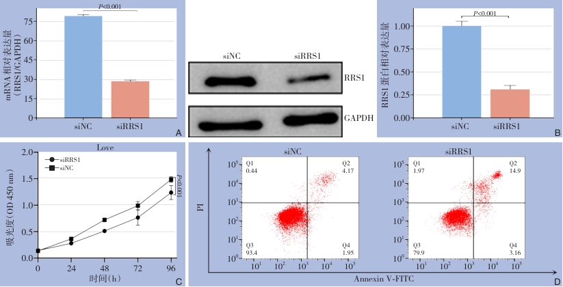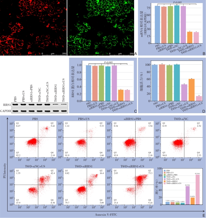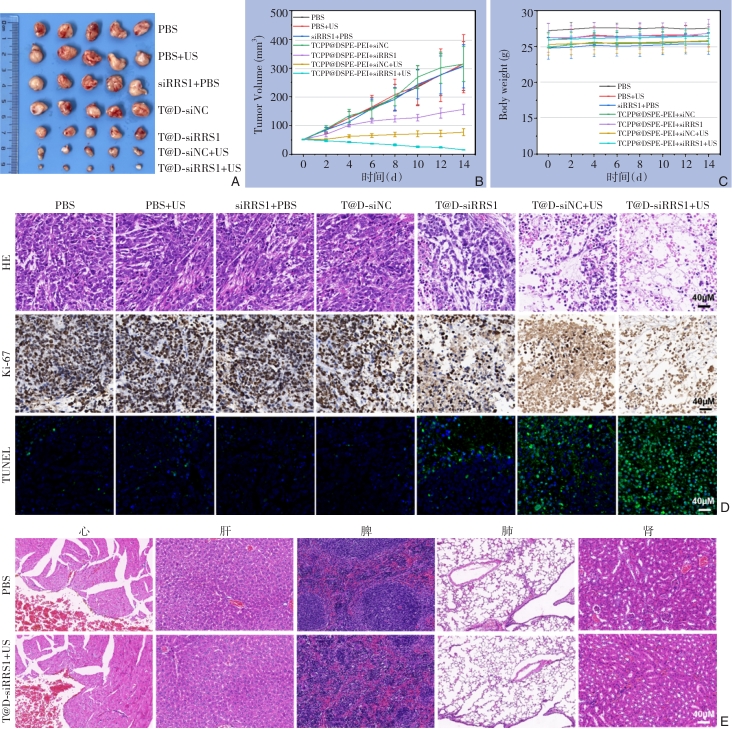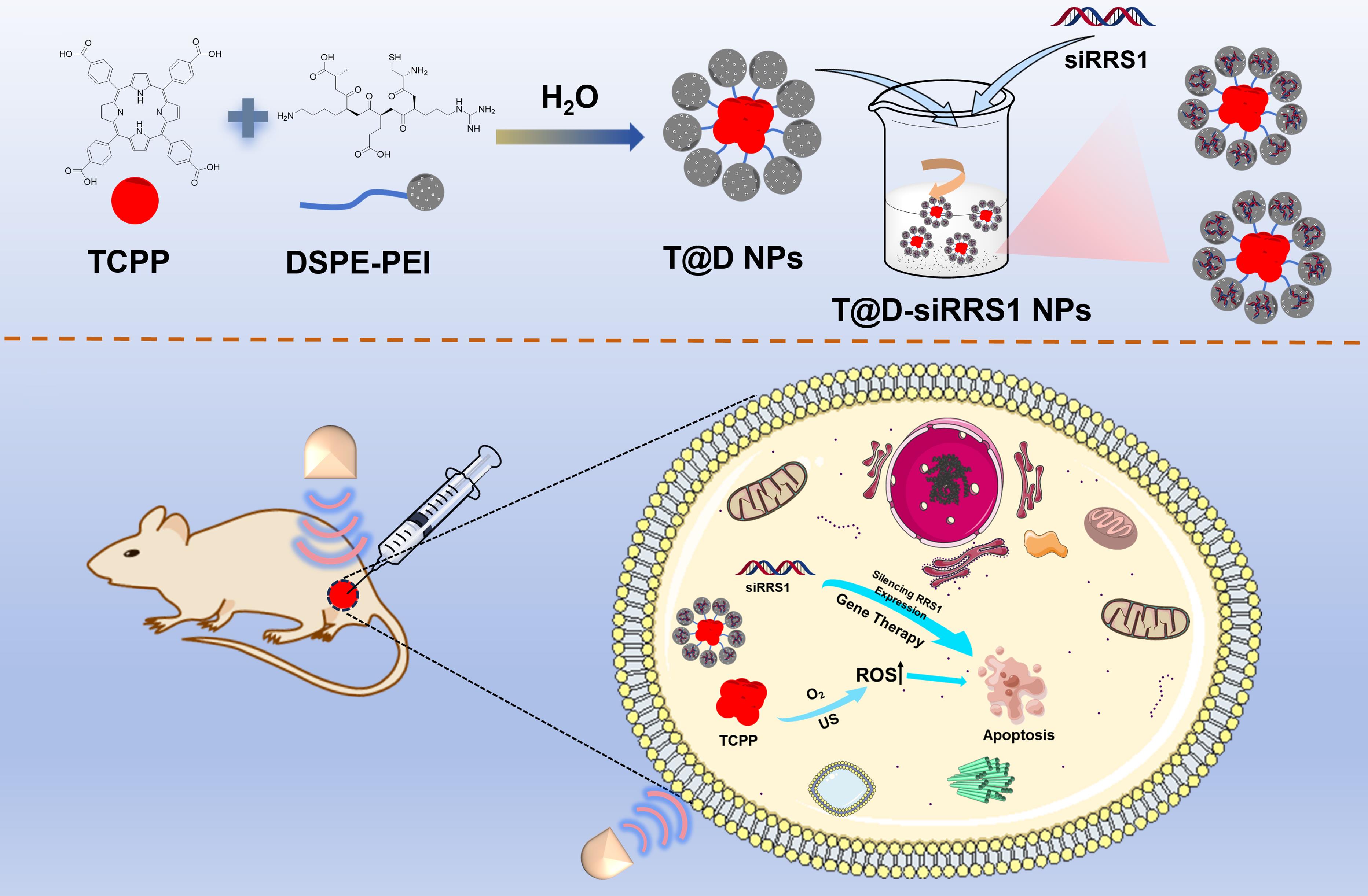 Abstract:Background and Aims Sonodynamic therapy (SDT) is an emerging tumor treatment method that primarily utilizes low-intensity ultrasound (US) to activate sonosensitizers, leading to the production of cytotoxic reactive oxygen species (ROS) that kill cells. This study was conducted with an attempt to develop a novel nanoparticle (NPs) formulation containing a sonosensitizer and the small interfering RNA (siRRS1) of tumor-related gene RRS1 to observe its anticancer effects on colon cancer, to provide new strategies for colon cancer treatment.Methods RRS1 RNA-Seq data were downloaded from the TCGA and GEO databases, and clinical pathological data were collected from 80 patients with colon cancer at Hunan Provincial People's Hospital. The expression of RRS1 in colon cancer and its relationship with prognosis were analyzed. The proliferation and apoptosis of colon cancer cells transfected with siRRS1 were observed. The sonosensitizer tetra (4-carboxyphenyl) porphyrin (TCPP), gene carrier DSPE-PEI, and siRRS1 were assembled into TCPP@DSPE-PEI-siRRS1 NPs (T@D-siRRS1 NPs). After structural characterization and examination of cellular uptake and ROS generation capabilities in vitro, the anticancer effects of T@D-siRRS1 NPs on colon cancer were assessed in cell experiments and tumor-bearing mouse models.Results Both database analysis and clinical specimen testing indicated that RRS1 expression in colon cancer tissues was higher than that in adjacent normal tissues, and high expression was associated with poor prognosis (HR=1.88, 95% CI=1.27-2.79, P=0.002). Univariate and multivariate analyses showed that RRS1 mRNA expression was an independent risk factor for overall survival in colon cancer patients (HR=1.354, 95% CI=1.447-2.215, P=0.031). Knockdown of RRS1 significantly reduced the proliferation capacity of colon cancer cells and increased apoptosis (both P<0.05). Characterization results showed that the particles were uniform and stable; T@D-siRRS1 NPs entered cells through endocytosis, where TCPP could generate singlet oxygen (1O?) under ultrasound irradiation. Subsequent in vitro and in vivo experimental results demonstrated that transfection with NPs carrying siRRS1 or TCPP (T@D-control siRNA, T@D-siRRS1) combined with US resulted in varying degrees of growth inhibition in colon cancer cells, with the T@D-siRRS1 NPs+US treatment showing the strongest effect (all P<0.05). Moreover, no significant damage was observed in the vital organs of mice treated with T@D-siRRS1 NPs+US.Conclusion T@D-siRRS1 NPs plus US integrate SDT and gene therapy, producing an effective synergistic cytotoxic effect on colon cancer cells. Additionally, T@D-siRRS1 NPs demonstrate good safety and biocompatibility, suggesting potential for clinical application.
