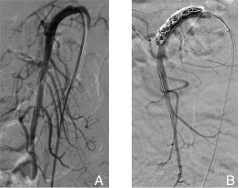 Abstract:Background and Aims Spontaneous isolated superior mesenteric artery dissection (SISMAD) is a relatively common type of visceral artery dissection, typically presenting with acute abdominal pain. In severe cases, it may lead to intestinal ischemia or even necrosis. With the widespread use of imaging techniques such as CT angiography (CTA), the detection rate of SISMAD has significantly increased. However, there is still controversy regarding its optimal treatment strategy, especially in choosing between conservative management and endovascular intervention, as no unified standard currently exists. This study aimed to compare the short- and medium-term outcomes of the two treatment modalities by retrospectively analyzing the clinical data of SISMAD patients treated at our center in order to provide evidence for individualized treatment decisions.Methods A retrospective analysis was conducted on 174 patients diagnosed with SISMAD at Ningbo Second Hospital between January 2018 and December 2023. Among them, 30 patients received conservative treatment, and 144 underwent endovascular intervention (including stent implantation alone or in combination with coil embolization of the false lumen). All patients were diagnosed using CTA or superior mesenteric artery angiography and classified accordingly. Patients were followed up at 1 month and 1 year after treatment to assess clinical symptom relief and radiological outcomes, including dissection remodeling and stent patency.Results In the conservative group, the symptom relief rate was 90.0% at 1 month and 92.8% at 1 year; in the interventional group, the corresponding rates were 99.3% and 98.6%. The difference in symptom relief at 1 month was statistically significant (P=0.016), while the difference at 1 year was not (P>0.05). Subgroup analysis by classification showed that the interventional group generally had higher symptom relief rates than the conservative group across all types. However, none of the differences reached statistical significance (all P>0.05). The conservative group showed poorer symptom control in type Ⅲ patients, including one death. The technical success rate of endovascular treatment was 99.3%, with no cases of stent displacement or occlusion within 1 year. The complete remodeling rate was 86.8%, and the stent patency rate was 100.0%. Some patients had minor mural thrombus formation within the stent without evidence of flow obstruction.Conclusion Endovascular intervention offers a high technical success rate and favorable short- and medium-term efficacy in SISMAD patients, particularly for type Ⅱ and Ⅲ cases with compromised true lumen perfusion. Treatment strategies should be tailored based on the dissection type and the degree of true lumen compression to improve clinical outcomes and reduce associated risks.
