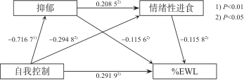Abstract:Background and aims Obesity is a major global health challenge, and laparoscopic sleeve gastrectomy (LSG) is a widely used bariatric procedure. However, weight loss outcomes vary considerably among patients. Psychological factors and eating behaviors are increasingly recognized as important determinants of postoperative success, yet the underlying mechanisms remain unclear. This study aimed to examine the relationship between self-control and 12-month postoperative weight loss (%EWL) after LSG, and to test the independent and chain mediating roles of depression and emotional eating.Methods In a cross-sectional study, 202 LSG patients from the Third Xiangya Hospital of Central South University completed the Brief Self-Control Scale (BSCS), Patient Health Questionnaire-9 (PHQ-9), and the emotional eating subscale of the Dutch Eating Behavior Questionnaire (DEBQ). %EWL within 12 months after surgery was calculated. Pearson correlations were conducted, and mediation was tested using Process v4.0 (model 6) with 5 000 bootstrap samples while controlling for sex and postoperative time.Results Overall, BSCS, PHQ-9, DEBQ-EE, and %EWL averaged 21.76±4.15, 5.54±3.91, 30.72±11.25, and (60.94±31.61)%, respectively. Self-control correlated negatively with depression (r=-0.697) and emotional eating (r=-0.441) and positively with %EWL (r=0.566; all P<0.01). %EWL correlated negatively with depression (r=-0.467) and emotional eating (r=-0.348, P<0.01). Adjusted regression showed positive prediction of %EWL by self-control (β=0.291 9, P<0.01) and negative prediction by depression (β=-0.155 6, P<0.05) and emotional eating (β=-0.115 8, P<0.05). Mediation analysis showed that the indirect effect through the path "self-control → depression → %EWL" was 0.848 8 (95% CI=0.178 7-1.573 0). The indirect effect through the path "self-control → emotional eating → %EWL" was 0.259 8 (95% CI=0.033 4-0.564 3). The chain indirect effect through the path "self-control → depression → emotional eating → %EWL" was 0.131 7 (95% CI=0.005 9-0.322 8); the total indirect effect accounted for 35.83% of the total effect.Conclusion Higher self-control after LSG enhances weight loss both directly and indirectly by alleviating depression and emotional eating. Routine psychological screening and eating-behavior interventions are warranted to consolidate long-term benefits.
