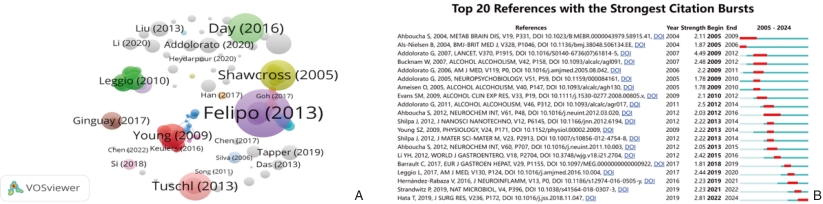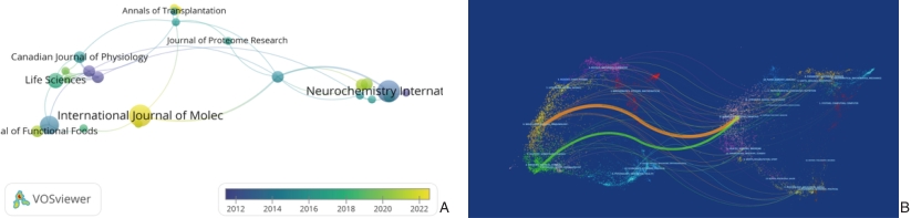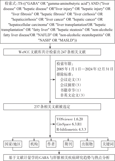 Abstract:Background and Aims Gamma-aminobutyric acid (GABA), the principal inhibitory neurotransmitter in the central nervous system, has been increasingly recognized in recent years as being closely associated with various liver-related diseases, such as hepatic encephalopathy, liver cirrhosis, and hepatocellular carcinoma. Abnormal GABA expression is strongly linked to pathological processes including cognitive impairment and neuroinflammation. Although numerous studies have investigated the mechanistic roles of GABA in neurological complications of liver disease, a systematic overview of the field's research trends, collaborative networks, and emerging hotspots remains lacking. This study employs bibliometric methods to comprehensively map the evolution and frontier topics in GABA and liver-related disease research from 2005 to 2024, aiming to inform future research planning and resource allocation in this area.Methods English-language publications from 2005 to 2024 related to GABA and liver-related diseases were retrieved from the Web of Science Core Collection. Eligible articles were analyzed using VOSviewer, CiteSpace, and the R package "bibliometrix" to visualize and evaluate contributions by countries/regions, institutions, authors, and journals. Additional analyses included keyword clustering, co-citation analysis, and thematic evolution of research topics.Results A total of 237 articles were included, contributed by 1 340 authors across 456 institutions in 47 countries, and published in 168 journals. The United States and China are leading contributors in this field. Although countries such as the United Kingdom and Italy had fewer publications, they demonstrated higher average citation counts, indicating strong research quality. Notably, Spain's Centro Investigación Principe Felipe and the research team led by Felipo Vicente exhibited high academic influence. Neurochemistry International and Hepatology were identified as core journals, with Hepatology having the highest impact factor (12.9). Keyword clustering revealed major research focuses including the regulatory role of GABA in the neural mechanisms of hepatic encephalopathy, the impact of liver-related metabolic disorders on neurotransmitter balance, the development and evaluation of GABA receptor-targeted therapeutics, and the function of the GABAergic system in the pathogenesis of hepatocellular carcinoma. As research deepens, the frequency of emerging keywords has diversified, with recent emphasis on terms such as "quality of life," "gene expression," and "fatty liver disease," reflecting a shift from fundamental mechanisms to clinical translation and interdisciplinary integration.Conclusion The relationship between GABA and liver diseases has become a focal point of interdisciplinary research. Investigations have expanded from pathological mechanisms to therapeutic applications, with growing interest in GABA's roles in hepatic encephalopathy, metabolic dysregulation, and tumor progression. Future studies should explore the specific functions of GABA receptor subtypes, promote the development of precision-targeted therapies, and investigate novel mechanisms such as the gut microbiota-GABA metabolism-brain-liver axis to broaden the clinical and translational potential of GABA in neurological, metabolic, and oncological contexts.