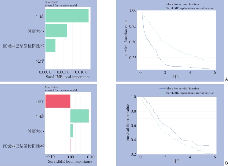 Abstract:Background and Aims Extrahepatic cholangiocarcinoma (ECCA) is a malignancy with insidious onset, strong invasiveness, and poor prognosis, characterized by a high postoperative recurrence rate and a 5-year overall survival of less than 20%. Most existing prognostic models are based on the Cox proportional hazards model, which is limited by the proportional hazards assumption and linearity constraints. The random survival forest (RSF) model, a novel machine learning algorithm, can capture complex interactions and nonlinear effects among variables; however, its application in ECCA remains scarce. Therefore, this study developed a prognostic model for ECCA patients after radical resection using the RSF algorithm, aiming to provide precise and individualized prognostic assessments and support clinical decision-making.Methods A total of 515 postoperative ECCA patients from the SEER database (2016-2021) were retrospectively enrolled and randomly divided into a training set (n=361) and a test set (n=154). Demographic and clinical variables were collected. Cox models were developed using univariate and multivariate regression, while RSF models were constructed using variable importance (VIMP) and minimal depth methods. Model performance was evaluated using the concordance index(C-index), time-dependent area under the curve(AUC), Brier scores, calibration plots, and decision curve analysis. Survival differences were assessed using Kaplan-Meier analysis, and interpretability was enhanced through the use of SurvSHAP and SurvLIME.Results Multivariate Cox regression identified seven independent prognostic factors: age, race, income, T stage, N stage, tumor size, and chemotherapy. The RSF model selected four key predictors: age, tumor size, lymph node positive rate, and chemotherapy. In the test cohort, the RSF model achieved a C-index of 0.751, outperforming the Cox model (0.711). The RSF model yielded AUCs of 0.843, 0.749, and 0.814 at 1, 2, and 3 years, respectively, with superior calibration, overall performance, and net clinical benefit. Nonlinear associations were observed for lymph node positive rate, age, and tumor size, while chemotherapy was associated with reduced mortality risk. Stratified survival curves indicated poorer prognosis in patients without chemotherapy, lymph node positive rate >0.1, age >70 years, or tumor size >20 mm.Conclusion The RSF model, based on only four readily available clinical variables, demonstrated superior predictive performance compared with the Cox model. It provides a reliable tool for individualized prognosis and postoperative management in ECCA patients. The integration of interpretability frameworks further enhances its clinical applicability, offering potential to improve survival outcomes and quality of life.