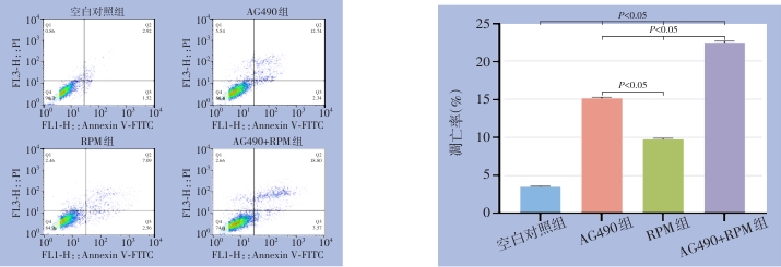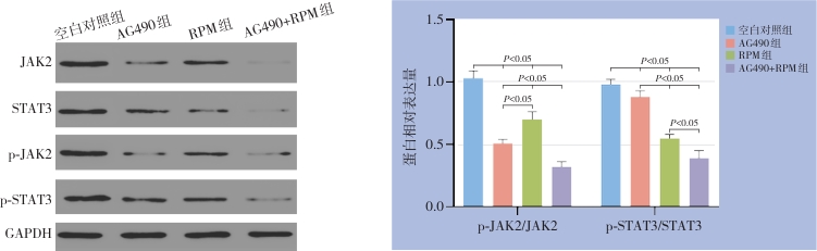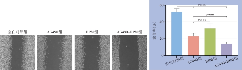 Abstract:Background and Aims Hepatocellular carcinoma (HCC) is one of the most common malignancies, with high incidence and mortality. The JAK/STAT signaling pathway plays a crucial role in regulating cell proliferation, apoptosis, and immune responses, and its persistent activation is closely associated with the development of HCC. This study aimed to investigate the effects of the JAK2 inhibitor AG490 and the STAT3-related inhibitor rapamycin (RPM) on the biological behaviors of HCC cells and their underlying molecular mechanisms.Methods Human hepatoma HepG2 cells were divided into four groups: blank control, AG490, RPM, and AG490+RPM. Cell proliferation, migration, and apoptosis were assessed by MTT assay, scratch test, and flow cytometry, respectively. ELISA and qRT-PCR were used to detect the protein and mRNA expression of Bax, Bcl-2, caspase-3, survivin, and c-Myc. A Western blot analysis was performed to examine the expression and phosphorylation levels of JAK2 and STAT3.Results Compared with the blank control group, the AG490, RPM, and AG490+RPM groups showed significantly decreased cell proliferation and migration abilities, as well as increased apoptosis, with the most pronounced effects observed in the AG490+RPM group (all P<0.05). Inhibitor-treated groups showed elevated expression of Bax and caspase-3, decreased expression of Bcl-2, survivin, and c-Myc, with the most significant changes in the AG490+RPM group (all P<0.05). In addition, the ratios of p-JAK2/JAK2 and p-STAT3/STAT3 were significantly reduced in all treated groups, with the lowest levels in the AG490+RPM group (all P<0.05).Conclusion Inhibitors targeting the JAK/STAT pathway significantly suppress proliferation and migration, and induce apoptosis in HCC cells, possibly by downregulating p-JAK2 and p-STAT3, as well as modulating genes related to apoptosis and proliferation. The combined use of AG490 and RPM exhibits superior antitumor effects, suggesting that multi-target blockade of the JAK/STAT pathway may represent a promising therapeutic strategy for HCC.