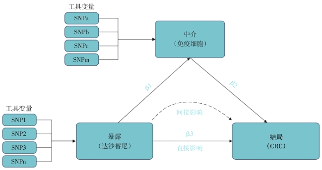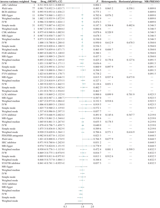 Abstract:Background and Aims Colorectal cancer (CRC) has a complex pathogenesis, and current treatments remain limited in efficacy for advanced metastatic disease. Dasatinib is a multi-target tyrosine kinase inhibitor that has shown potential antitumor activity in various solid tumors. This study aimed to evaluate the causal relationships between dasatinib-related target genes and CRC based on genetic variation, and to explore the mediating role of immune cells, thereby providing genetic epidemiological evidence for the prevention and targeted therapy of CRC.Methods Dasatinib-related target genes were identified through DrugBank, and the corresponding eQTLs, GWAS data for CRC (ebi-a-GCST90018808), and 731 immune-cell traits were obtained from the IEU OpenGWAS database. A two-sample Mendelian randomization (MR) framework with a two-step mediation approach was applied: first, to assess the causal relationship between dasatinib target genes (as exposures) and CRC; second, to evaluate the causal effects between target genes and immune cells, as well as between immune cells and CRC; and finally, to calculate the proportion of mediated effects. Wald ratio, inverse-variance weighted (IVW), MR-Egger, MR-PRESSO, Cochran's Q, I2, and leave-one-out analyses were used to examine heterogeneity, horizontal pleiotropy, and robustness.Results MR results showed that dasatinib-associated inhibition of ABL1 was significantly associated with a reduced risk of CRC (OR=0.511 0, 95% CI=0.323 1-0.808 0, P=0.004 1). Inhibition of YES1 was also associated with decreased CRC risk (IVW OR=0.889 9, 95% CI=0.811 6-0.975 8, P=0.013 1), with no evident heterogeneity or horizontal pleiotropy among the corresponding SNPs. Further analysis revealed that dasatinib-related inhibition of YES1 significantly reduced the levels of IgD-CD24-AC level (OR=0.818 0, 95% CI=0.678 2-0.986 7, P=0.035 7), and this immune cell subset itself was identified as a risk factor for CRC (OR=1.105 7, 95% CI=1.029 6-1.187 5, P=0.005 7). Mediation analysis indicated that IgD-CD24-AC accounted for -9.89% and 17.31% of the mediation effects in the ABL1→CRC and YES1→CRC pathways, respectively.Conclusion Genetic evidence from MR suggests dasatinib-target genes ABL1 and YES1 are causally linked to reduced CRC risk, with IgD-CD24-AC partially mediating the YES1-related protective effect. These findings point to immune-mediated mechanisms underlying dasatinib's potential influence on CRC risk; further experimental validation and replication across populations are warranted.