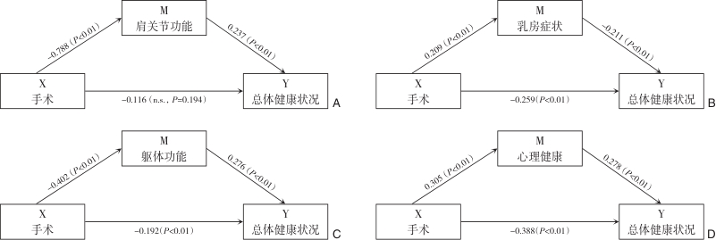 Abstract:Background and Aims Surgical treatment is a cornerstone of breast cancer management; however, the physical trauma and psychological burden associated with surgery may adversely affect patients' quality of life (QoL). Based on data from a prospective cohort, this study was conducted to evaluate changes in postoperative QoL among breast cancer patients and to identify mediating factors influencing QoL, thereby providing evidence for perioperative rehabilitation strategies.Methods Female breast cancer patients who underwent local surgical treatment at Suining Central Hospital between June 2024 and January 2025 were enrolled. The Constant-Murley Shoulder Score, EORTC QLQ-C30, and QLQ-BR23 questionnaires were used pre- and postoperatively to assess shoulder joint function, and QoL. Paired t-tests were used to analyze changes in scores before and after surgery. A mediation model was applied to explore the indirect pathways through which surgery impacts QoL. Additionally, subgroup analyses were conducted to compare QoL changes across different surgical modalities.Results A total of 148 patients were included, with median age of 54 (46-60) years old Postoperative psychological health significantly improved, while shoulder function and overall QoL scores markedly declined (all P<0.001). According to QLQ-C30, functional domains such as physical and role functioning worsened, while symptom burden increased. The QLQ-BR23 revealed significantly higher scores for breast and upper limb symptoms postoperatively (both P<0.001). Subgroup analyses showed that patients undergoing axillary lymph node dissection experienced greater declines in shoulder function and QoL compared to those receiving sentinel lymph node biopsy (both P<0.05). QoL deterioration was comparable between mastectomy and breast-conserving surgery, although the former was associated with more prominent pain and breast symptoms. Mediation analysis indicated that shoulder function, breast symptoms, and physical functioning served as mediators in the impact of surgery on QoL, while better psychological health exerted a protective effect.Conclusion Surgical treatment significantly affects postoperative QoL in breast cancer patients, with local functional impairment and symptom exacerbation serving as key mediators. Different surgical approaches have varying impacts on QoL. Enhancing postoperative shoulder rehabilitation, symptom management, and psychological support may improve patients' QoL.