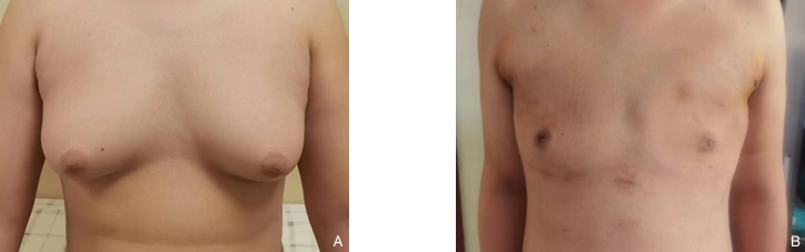 Abstract:Background and Aims Gynecomastia is a common benign breast condition in males that may cause abnormal breast contour and psychological distress. Endoscopic subcutaneous mastectomy has gradually become an important surgical option due to its concealed incision, clear operative field, and superior cosmetic outcomes. This study aimed to summarize the key operative techniques, postoperative complications, and follow-up outcomes of endoscopic mastectomy for gynecomastia.Methods A retrospective analysis was conducted on 17 patients who underwent endoscopic mastectomy for gynecomastia between May 2023 and February 2025. General information, surgical procedures, postoperative complications, and satisfaction results were reviewed. Operative time, intraoperative blood loss, drainage volume during the first three postoperative days, time to drain removal, and length of hospitalization were recorded. Postoperative satisfaction was evaluated using the BODY-Q chest module. Follow-up lasted 3-24 months.Results All procedures were successfully completed without conversion or major complications. The mean unilateral operative time was (69.88±14.23) min, and intraoperative blood loss was (22.38±10.69) mL. The median drainage volumes on postoperative days 1, 2, and 3 were 28.00 (14.00-57.50) mL, 17.50 (15.00-24.75) mL, and 14.00 (7.75-24.75) mL, respectively. The mean time to drain removal was (6.50±1.66) d, and postoperative hospital stay was 5-10 d. All pathological results were benign (15 cases of gynecomastia and 2 cases of fibrofatty hyperplasia). Postoperative complications included skin bruising in 3 patients (17.6%) and subcutaneous hematoma in 1 patient (5.9%); all resolved spontaneously or with simple treatment. No nipple retraction, skin-flap necrosis, sensory disturbance, or breast asymmetry was observed. No glandular residue or recurrence occurred during follow-up. All patients achieved satisfaction scores above 3, indicating excellent cosmetic outcomes.Conclusion Endoscopic mastectomy for gynecomastia is safe, minimally invasive, and associated with a low rate of complications. Its concealed incision and favorable aesthetic results yield high patient satisfaction, making it a technique worthy of wider clinical adoption.