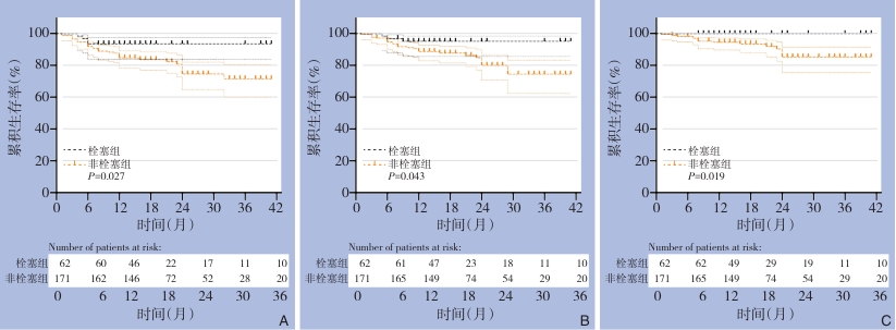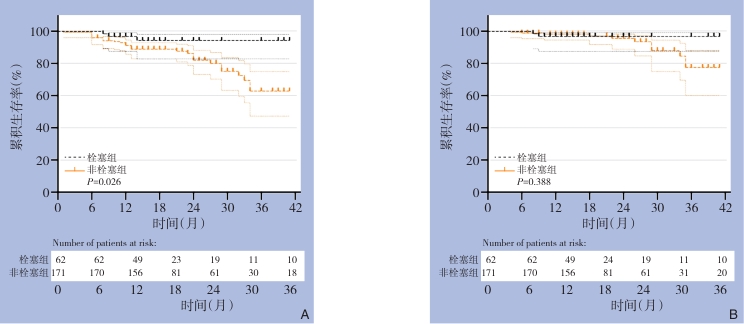 Abstract:Background and Aims Type Ⅱ endoleak remains the most common complication after endovascular aneurysm repair (EVAR) and is closely associated with aneurysmal sac enlargement and secondary interventions. The inferior mesenteric artery (IMA) is a major source of type Ⅱ endoleak; however, the clinical benefit of prophylactic IMA embolization remains controversial. This study aimed to evaluate the impact of prophylactic IMA embolization on postoperative outcomes following EVAR.Methods Patients with infrarenal abdominal aortic aneurysm who underwent EVAR between January 2022 and January 2024 were retrospectively reviewed. Patients were divided into an embolization group and a non-embolization group according to whether prophylactic IMA embolization was performed. Baseline characteristics, perioperative data, and follow-up outcomes were compared. Kaplan-Meier analysis was used to assess endoleak-free survival, type Ⅱ endoleak-free survival, freedom from sac enlargement, and freedom from reintervention.Results A total of 233 patients were included, of whom 62 underwent prophylactic IMA embolization. No significant differences were observed in baseline clinical or anatomical characteristics between the embolization group and a non-embolization group (all P>0.05). During a mean follow-up of (19.6±9.7) months, the embolization group demonstrated significantly higher 2-year endoleak-free survival (93.55% vs. 74.53%, P=0.027), type Ⅱ endoleak-free survival (95.11% vs. 80.02%, P=0.043), IMA-related type Ⅱ endoleak-free survival (100.0% vs. 85.26%, P=0.019), and freedom from aneurysmal sac enlargement (94.27% vs. 81.96%, P=0.026) compared with the non-embolization group. No significant difference was observed in reintervention-free survival between the two groups (P=0.388).Conclusion Prophylactic IMA embolization significantly reduces postoperative endoleaks, particularly IMA-related type Ⅱ endoleaks, and is associated with improved control of aneurysmal sac enlargement after EVAR. However, its effect on reducing reintervention rates remains uncertain and warrants further validation in larger, long-term studies.