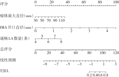 Abstract:Background and Aims Type Ⅱ endoleak (T2EL) is the most common complication after endovascular abdominal aortic aneurysm repair (EVAR). While many cases remain benign, a subset may progress with aneurysm sac enlargement and require reintervention. Identifying risk factors for progressive T2EL and establishing a reliable risk stratification model may improve perioperative decision-making and postoperative surveillance. This study aimed to investigate the risk factors and threshold values for progressive T2EL after EVAR and to develop a nomogram-based prediction model.Methods Clinical data of patients who developed T2EL after EVAR for abdominal aortic aneurysm between March 2013 and December 2024 were retrospectively reviewed. Patients were classified into a progressive group (n=21) or a stable group (n=62) based on whether intervention criteria (An increase in the maximum aneurysm diameter of ≥10 mm compared with baseline) were met during follow-up. Clinical characteristics, anatomical parameters, and operative variables were compared. Multivariate Logistic regression was performed to identify independent risk factors for progressive T2EL. Receiver operating characteristic (ROC) curves were used to determine optimal cutoff values. A nomogram prediction model was constructed and internally validated using discrimination, calibration, and decision curve analyses.Results The progressive group had a significantly larger maximum aneurysm diameter, greater inferior mesenteric artery (IMA) ostial diameter, and a higher number of patent lumbar arteries (LA) compared with the stable group (all P<0.05). Multivariate analysis identified these three variables as independent risk factors for progressive T2EL after EVAR (all P<0.05). ROC analysis demonstrated increased risk of progressive T2EL in patients with a maximum aneurysm diameter ≥54.30 mm, IMA ostial diameter ≥2.82 mm, and ≥6 patent LA. The nomogram achieved a C-index of 0.858, which remained robust after internal validation (corrected C-index: 0.837), showing good discrimination, calibration, and clinical utility.Conclusion Maximum aneurysm diameter, IMA ostial diameter, and the number of patent LA are key predictors of progressive T2EL after EVAR. The proposed nomogram provides effective individualized risk assessment, although external validation is required before widespread clinical application.