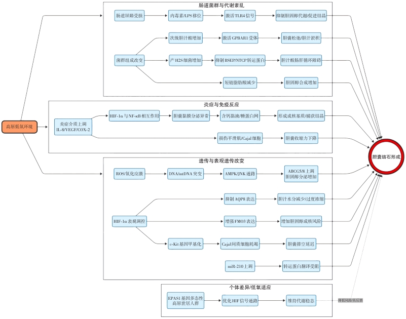 Abstract:Hypoxia at high altitude is an important environmental factor influencing human metabolism and disease patterns. Recent epidemiological studies have shown that the prevalence of gallbladder stones is significantly higher in high-altitude regions than in low-altitude areas, yet the underlying mechanisms remain incompletely understood. Emerging evidence suggests that high-altitude hypoxia may promote gallstone formation through multiple pathways, including alterations in hepatic lipid and cholesterol metabolism, changes in bile composition, impairment of gallbladder contractility, disruption of gut microbiota homeostasis, and activation of inflammatory responses. In addition, hypoxia-induced oxidative stress, DNA damage, and epigenetic regulation may further contribute to lithogenesis. Genetic adaptation to hypoxia, such as polymorphisms in EPAS1 and related genes, may also influence individual susceptibility to gallstone disease among high-altitude populations. This review summarizes current research progress on the relationship between high-altitude hypoxia and gallbladder stones, focusing on potential mechanisms involving metabolic regulation, gallbladder motility, gut microbiota alterations, and inflammatory-epigenetic pathways, with the aim of providing insights for prevention and future research on gallstone disease in high-altitude regions.