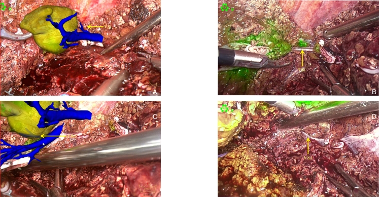 Abstract:Background and Aims Laparoscopic resection of centrally located hepatic tumors remains technically demanding due to the complex anatomical relationships with major vascular structures. Conventional intraoperative ultrasound or indocyanine green fluorescence imaging (ICG-FI) alone has limitations, particularly in visualizing deep anatomical structures. This study aimed to evaluate the clinical value of augmented reality (AR) navigation combined with ICG-FI in laparoscopic resection of central hepatic tumors.Methods A retrospective analysis was conducted on 38 consecutive patients who underwent laparoscopic resection of central hepatic tumors guided by AR navigation combined with ICG-FI between May 2022 and March 2025. Intraoperative navigation performance, surgical parameters, and perioperative outcomes were assessed.Results All 38 procedures were completed laparoscopically without conversion. The intraoperative tumor fluorescence detection rate was 100%. The mean operative time was (324.9 ± 132.4) min, and the median intraoperative blood loss was 400 (50-1 200) mL. The mean registration error was (6.3±0.6) mm. The median number of predicted and verified vessels was 6 (4-8) and 7 (5-10), respectively. R0 resection was achieved in all patients, with a mean surgical margin of (1.5±0.5) cm. The postoperative complication rate was 13.2%, with no severe complications such as intra-abdominal hemorrhage, gas embolism, or liver failure. The median postoperative hospital stay was 9 (4-20) days. During a median follow-up of 20 months, no tumor recurrence was observed.Conclusion The combined use of AR navigation and ICG-FI enables intraoperative prediction and verification of critical vascular structures and facilitates precise control of the transection plane in laparoscopic resection of central hepatic tumors. This technique improves surgical precision and safety and shows promising clinical potential.