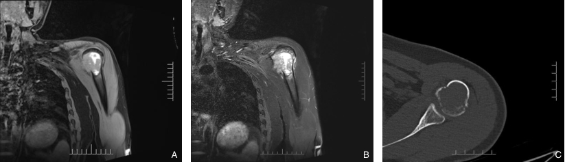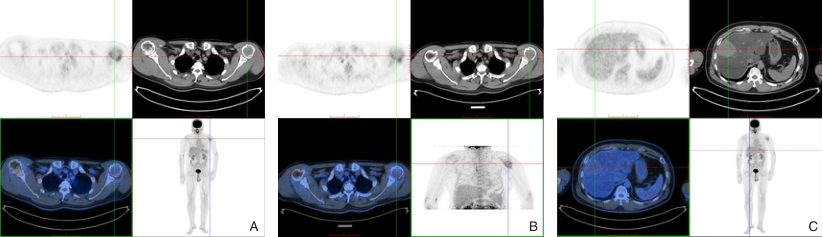 Abstract:Background and Aims Hepatocellular carcinoma (HCC) presenting initially with bone metastasis is uncommon, and metastasis to the appendicular skeleton is particularly rare. These cases often lack typical liver disease history, elevated alpha-fetoprotein (AFP), or characteristic imaging findings, leading to frequent misdiagnosis or delayed diagnosis. This study reports a rare case of occult HCC presenting with humeral metastasis and reviews the literature to improve clinical recognition and management.Methods The clinical data of a 42-year-old male patient presenting with humeral metastasis as the initial manifestation admitted in August 2025 were retrospectively analyzed, including laboratory tests, multimodal imaging findings, histopathological and immunohistochemical results, treatment, and follow-up outcomes. Relevant literature was also reviewed.Results The patient presented with left shoulder pain. Imaging revealed osteolytic destruction of the left humerus. PET/CT incidentally detected multiple hepatic lesions without significant FDG uptake. Contrast-enhanced ultrasound demonstrated atypical enhancement patterns, initially suggesting a perivascular epithelioid cell tumor. Histopathological and immunohistochemical examination of biopsy specimens from both the humeral and hepatic lesions confirmed moderately differentiated hepatocellular carcinoma with humeral metastasis (CNLC stage IIIb). The patient received systemic therapy with sintilimab plus bevacizumab, followed by transcatheter arterial chemoembolization. After 6 months of follow-up, the intrahepatic lesions had decreased in size, the bone metastasis remained stable, and pain symptoms were significantly relieved.Conclusion HCC presenting with humeral metastasis as the initial manifestation is extremely rare and may lack typical imaging and serological features. Clinicians should consider HCC in patients with unexplained bone metastasis even in the absence of liver disease history or elevated AFP. Multimodal imaging and pathological biopsy are essential for accurate diagnosis and appropriate management.