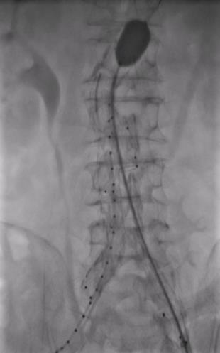 图2 预留5 F导管下移至瘤颈末端的瘤腔顶点Fig.2 The reserved 5 F catheter advanced downward to the apex of the aneurysm sac at the distal end of the aneurysm neck