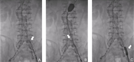 图5 髂动脉瘤瘤腔填充 A:髂动脉瘤注射纤维蛋白粘合剂;B:纤维蛋白粘合剂自分叉处弥散入对侧;C:球囊阻断髂支远端,避免纤维蛋白粘合剂溢出瘤腔Fig.5 Aneurysm sac filling for iliac artery aneurysm A: Injection of fibrin sealant into the iliac artery aneurysm; B: Fibrin sealant dispersing across the bifurcation to the contralateral side; C: Balloon occlusion of the distal iliac branch to prevent fibrin sealant from escaping the aneurysm