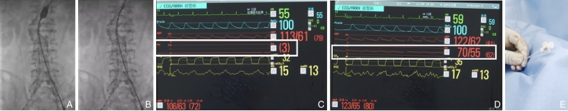 图6 判断瘤腔填充是否完全 A:回缩主动脉阻断球囊后,造影剂不流动;B:经导管动脉测压;C:存在内漏时,瘤腔内压力检测到动脉波形;D:内漏消失后,瘤腔内压力波形为一直线;E:内漏消失后,预置导管无反流血Fig.6 Assessment of complete aneurysm sac filling A: No contrast flow after withdrawal of the aortic occlusion balloon; B: Intra-arterial pressure measurement via catheter; C: Presence of an arterial waveform within the sac pressure tracing when an endoleak exists; D: A flat pressure waveform within the sac after resolution of the endoleak; E: Absence of blood reflux from the pre-positioned catheter after elimination of the endoleak