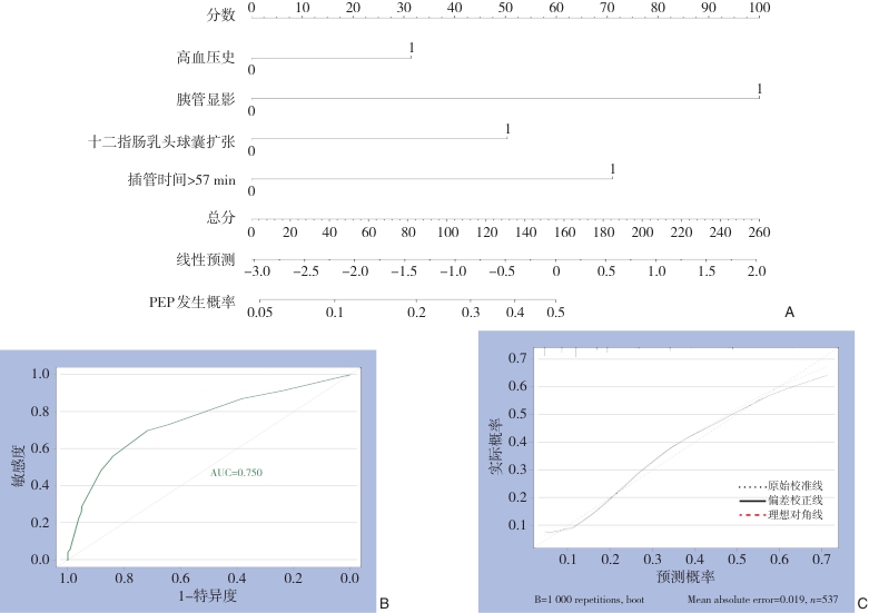Abstract:Background and Aims Post-endoscopic retrograde cholangiopancreatography (ERCP) pancreatitis (PEP) is the most common complication and is associated with prolonged hospitalization and increased healthcare burden. Although several risk factors have been identified, a simple and clinically applicable prediction tool based on routine variables remains lacking. This study aimed to identify risk factors for PEP and to develop a practical prediction model.Methods A retrospective analysis was conducted on 537 patients who underwent ERCP between January 2020 and June 2025. Patients were divided into PEP and non-PEP groups. Univariate and multivariate logistic regression analyses were performed to identify independent risk factors. A nomogram was constructed and evaluated using receiver operating characteristic (ROC) and calibration curves.Results PEP occurred in 93 patients (17.3%). Multivariate analysis identified a history of hypertension (OR=2.014), pancreatic duct opacification (OR=4.663), endoscopic papillary balloon dilation (OR=2.459), and cannulation time >57 min (OR=3.530) as independent risk factors (all P<0.05). The nomogram demonstrated good discrimination (AUC=0.750) and calibration (Hosmer-Lemeshow test, P=0.793). Among patients undergoing endoscopic papillary balloon dilation, there was no significant difference in the incidence of PEP between those with and without pancreatic duct stent placement (P>0.05).Conclusion A history of hypertension, pancreatic duct opacification, endoscopic papillary balloon dilation, and prolonged cannulation time are closely associated with the occurrence of PEP. The proposed nomogram provides a simple and effective tool for individualized risk prediction and may assist in optimizing preventive strategies for ERCP patients.