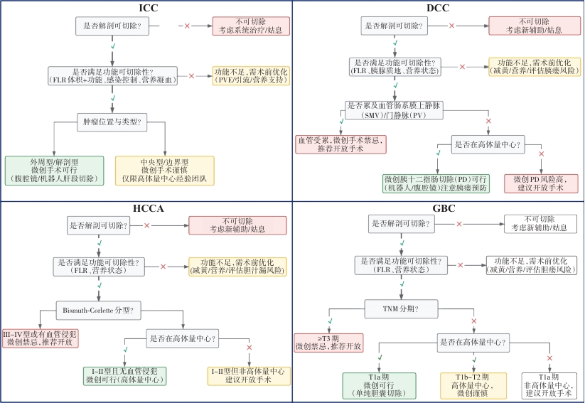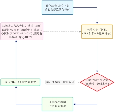 Abstract:Radical resection remains the cornerstone of long-term survival in biliary tract cancers (BTC). However, obstructive jaundice, cholangitis, impaired hepatic reserve, and treatment-related liver injury concentrate perioperative risks along a "cholestasis-infection-functional failure" cascade, and minimally invasive access alone cannot offset these functional costs. Based on current guidelines and emerging evidence, we propose a multistage care pathway centered on the concept of functional resectability, encompassing conversion/neoadjuvant therapy, preoperative functional reassessment, function-oriented surgery, and postoperative rehabilitation with long-term follow-up. Preoperative decision-making is anchored to combined "volume-plus-function" evaluation of the future liver remnant. When necessary, regional liver function is quantified using 99mTc-mebrofenin SPECT/CT and indocyanine green clearance testing, while selective biliary drainage, infection control, nutritional and coagulation optimization, and portal vein embolization are applied to establish a functional safety window. Intraoperatively, indocyanine green fluorescence imaging, intraoperative ultrasound, and three-dimensional planning are integrated to facilitate R0 resection and optimize reconstruction. Postoperatively, ERAS-based management is adopted, and key endpoints-including post-hepatectomy liver failure, clinically relevant postoperative pancreatic fistula, and patient-reported outcomes-are used to evaluate treatment benefit. This pathway emphasizes a "function-first, minimally invasive second" strategy, forming a closed loop of dynamic assessment, proactive intervention, and outcome measurement to maximize functional preservation and quality of life while maintaining oncological radicality.