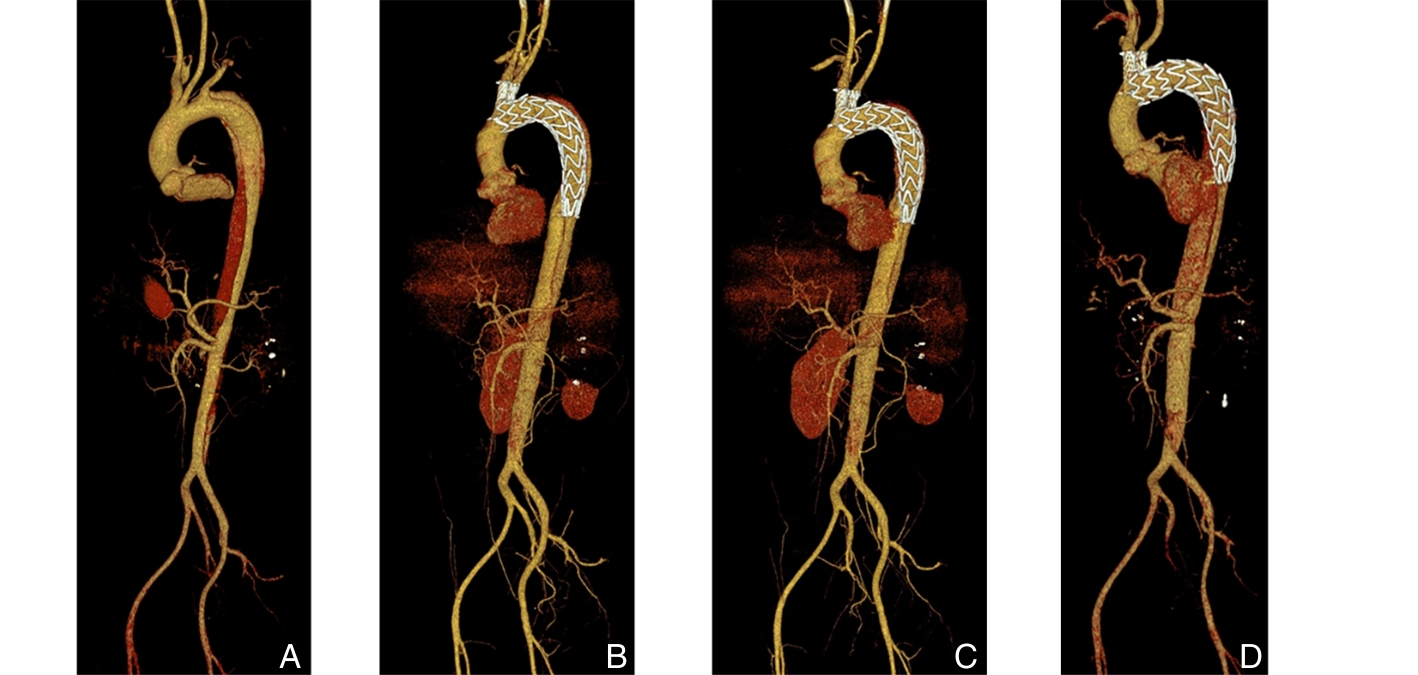 摘要:背景与目的 胸主动脉腔内修复术(TEVAR)已成为治疗胸主动脉疾病的重要微创手段,但在近端锚定区位于Z0区的复杂主动脉弓部病变中,如何同期重建弓上分支血管仍是技术难点。Castor分支型主动脉覆膜支架可实现左颈总动脉(LCCA)的一体化重建,但其在Z0区应用通常需联合其他技术重建无名动脉(IA)。本研究旨在初步评估Castor分支型支架重建LCCA联合IA烟囱支架技术在Z0区TEVAR中的技术可行性及短期疗效。方法 回顾性分析2024年2月—2024年6月在中南大学湘雅二医院接受Castor分支型主动脉覆膜支架重建LCCA联合IA烟囱支架技术行Z0区TEVAR的主动脉疾病患者资料。收集并分析患者围手术期临床特征、手术相关参数及随访结果,主要观察指标包括技术成功率、围手术期并发症发生情况及弓上分支血管通畅率。左锁骨下动脉(LSA)是否同期重建依据术前影像学评估结果个体化决策。结果 共纳入6例患者,平均年龄51.5岁,男性5例。原发病包括主动脉夹层4例、主动脉弓部动脉瘤1例及穿透性主动脉溃疡1例。所有患者均成功完成手术,技术成功率为100%。其中3例同期行LSA血运重建。术后30 d内未发生死亡、脑卒中、截瘫、内漏、逆撕性A型主动脉夹层、支架移位及上肢缺血等严重并发症。中位随访13(11~15)个月,随访期间未出现主要不良心脑血管事件或支架相关并发症,影像学显示IA、LCCA及重建LSA通畅率均为100%。结论 在严格筛选的小样本患者中,Castor分支型主动脉覆膜支架重建LCCA联合IA烟囱支架技术用于Z0区TEVAR在技术上可行,且短期随访结果显示分支血管通畅率良好。但其安全性及远期疗效仍需通过更大样本量及长期随访研究进一步验证。