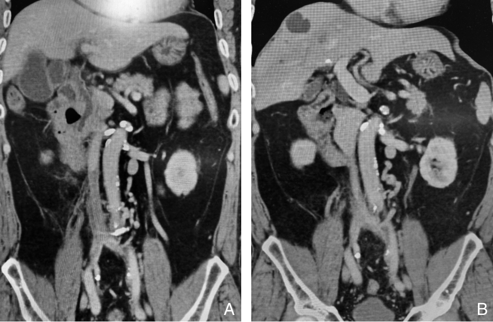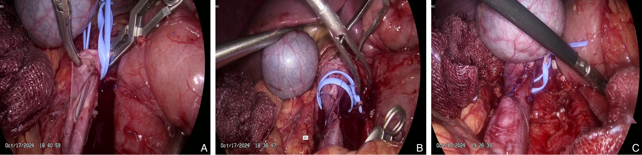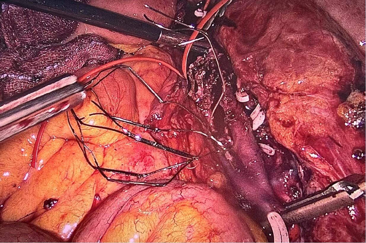 摘要:背景与目的 下腔静脉滤器在预防深静脉血栓脱落导致肺栓塞中具有重要作用,但部分滤器因回收钩贴壁、内膜增生包裹或穿出血管壁等原因,无法经血管腔内途径取出。本研究旨在总结腹腔镜下取出下腔静脉困难滤器的手术经验,评价其安全性与可行性。方法 回顾性分析2024年3月—2025年5月在广州医科大学附属第二医院行腹腔镜下腔静脉滤器取出的12例困难滤器患者临床资料。所有患者均曾尝试经血管腔内途径取出滤器失败。根据滤器位置选择头侧或尾侧入路,经腹腔前正中途径行腹腔镜手术,记录手术成功率、手术时间、术中出血量、围术期并发症及随访情况。结果 12例患者中,伞形滤器10例,梭形滤器2例;滤器植入中位时间为3(1.3~11.5)个月。滤器主要位于肾静脉周围区域(91.7%)。11例采用头侧入路,1例采用尾侧入路。11例(91.7%)成功经腹腔镜完整取出滤器,1例因梭形滤器顶端进入肾区、血管阻断不完全致术中出血失控而中转开腹。平均手术时间为(252.8±83.2)min,中位术中出血量150(50~500)mL。所有患者术后均顺利康复出院,无腹腔或切口感染。随访(9.8±3.8)个月,未见下腔静脉血栓形成或管腔狭窄。结论 对于经血管腔内途径取出失败的下腔静脉困难滤器,腹腔镜下取出术是一种安全、有效的微创替代方案。该术式的成功依赖于合理选择手术入路、充分的滤器段血管阻断及针对不同滤器类型采取个体化取出策略,但对术者腹腔镜血管外科技术要求较高。