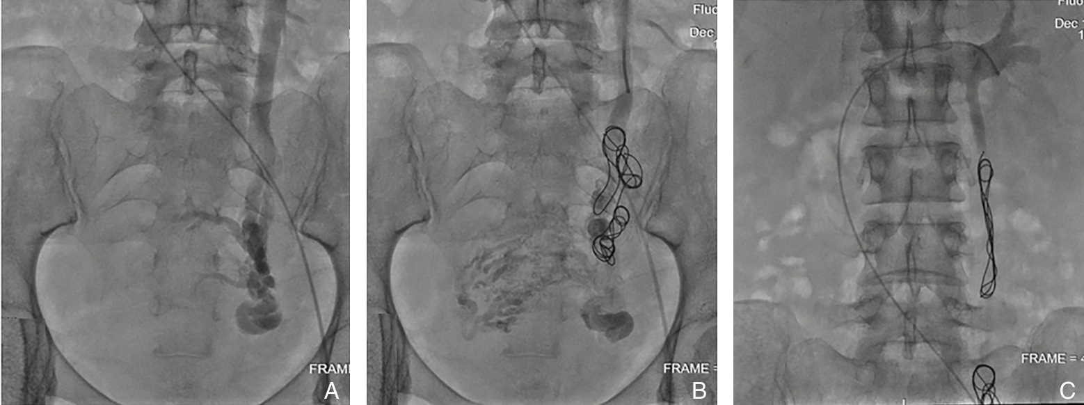 摘要:背景与目的 盆腔静脉疾病(PeVD)是慢性盆腔痛的重要血管性病因,其中卵巢静脉反流最为常见。卵巢静脉栓塞已被证实具有良好疗效,但在实际应用中,栓塞范围、弹簧圈数量及是否需要联合处理其他盆腔静脉病变等技术细节尚缺乏统一共识。本研究旨在评估采用简化策略的左侧卵巢静脉弹簧圈栓塞联合硬化剂注射治疗PeVD的短中期疗效及安全性。方法 回顾性分析2023年2月—2024年2月收治的55例PeVD女性患者,均经超声、CT静脉造影及静脉造影确诊,并接受左侧卵巢静脉弹簧圈栓塞联合硬化剂治疗。随访1、3、6、12个月,比较术前与术后疼痛视觉模拟评分(VAS)、症状改善情况及并发症发生情况;术后3个月行超声评估卵巢静脉闭塞及盆腔静脉改善情况。结果 所有患者均获得技术成功。术后12个月VAS由术前的7.2±1.2降至2.9±2.8(P<0.01),81.8%患者症状改善,其中50.9%症状完全消失。术后3个月超声显示卵巢静脉均完全闭塞,左侧宫旁静脉直径较术前显著减小[(7.1±1.4)mm vs. (3.4±0.7)mm,P<0.001]。总体并发症发生率为14.5%,以一过性盆腔痛为主,均经对症处理后缓解。结论 采用简化栓塞策略的左侧卵巢静脉弹簧圈栓塞联合硬化剂注射治疗PeVD具有良好的短中期疗效和安全性,可作为以左侧卵巢静脉反流为主患者的有效微创治疗方案。