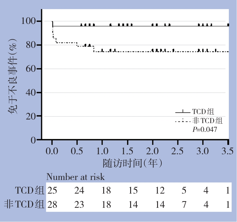 摘要:背景与目的 颈动脉内膜切除术(CEA)是治疗颈动脉狭窄的主要手段,但术中血流阻断及术后再灌注可能导致脑梗死及脑高灌注综合征(CHS)等神经系统并发症。如何在围手术期实时、动态评估脑灌注状态并指导个体化管理,仍缺乏统一有效的监测手段。本研究旨在评估经颅多普勒超声(TCD)监测在CEA围手术期安全性保障及远期预后改善中的临床价值。方法 回顾性分析2022年2月—2024年12月在中南大学湘雅二医院血管外科接受CEA的患者资料。根据围手术期是否应用TCD监测分为TCD组和非TCD组。比较两组患者的基线特征、围手术期处理、并发症发生情况及远期随访结局,并对TCD监测下脑血流动力学变化进行分析。结果 共纳入53例患者,其中TCD组25例,非TCD组28例。两组患者在年龄、性别及主要危险因素方面差异均无统计学意义(均P>0.05)。手术时间、住院时间及术中转流使用率在两组间差异均无统计学意义(均P>0.05)。术后30 d内,TCD组未发生短暂性脑缺血发作(TIA)及CHS,非TCD组分别发生2例TIA和3例CHS。随访期间,TCD组未发生不良事件,非TCD组发生2例不良事件。Kaplan-Meier分析显示,TCD组3.5年内无不良事件生存率明显高于非TCD组(P=0.047)。结论 CEA术中应用TCD监测与更优的远期无不良事件生存率显著相关。TCD可通过实时评估脑血流动力学变化,识别低灌注及脑高灌注高危患者,并指导围手术期精细化管理,具有重要的临床应用价值。
