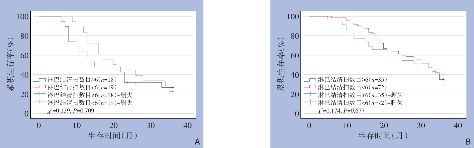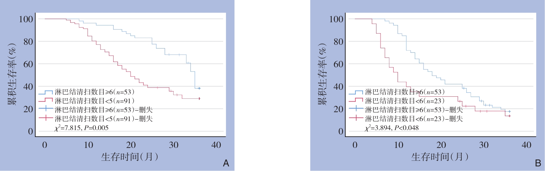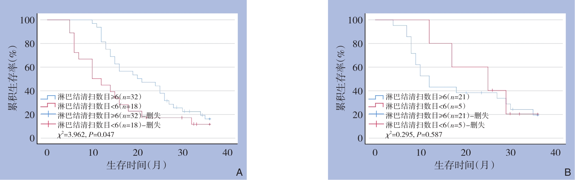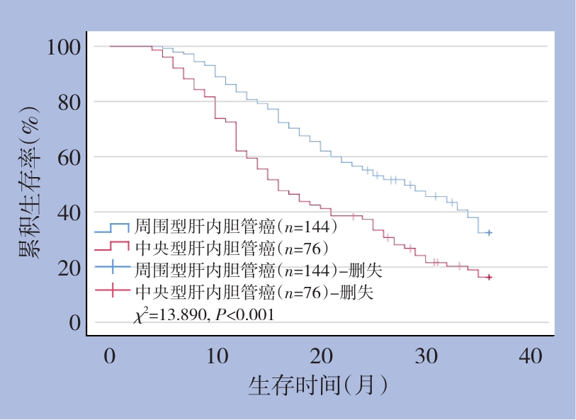 摘要:背景与目的 肝内胆管癌(ICC)发病率逐年升高,因起病隐匿、早期诊断率低,根治性切除仍是唯一可能治愈的手段。淋巴结转移是ICC预后不良的重要危险因素,但目前关于淋巴结清扫范围及其治疗价值仍存争议。有研究提示淋巴结清扫对中央型ICC的获益可能大于周围型ICC。临床主要依赖影像学评估淋巴结状态,但准确率有限。本研究旨在探讨淋巴结清扫对不同解剖部位ICC患者预后的影响,为手术策略选择提供依据。方法 回顾性分析2016年5月—2021年5月在中国人民解放军联勤保障部队第九〇四医院行根治性切除的220例ICC患者的临床资料,其中男性126例、女性94例,平均年龄(56.76±13.15)岁。根据肿瘤解剖部位分为周围型(144例)和中央型(76例)。比较两组在临床特征、白蛋白-胆红素(ALBI)评分分级、术前淋巴结转移风险、淋巴结清扫数目、淋巴结转移情况及术后生存差异,并进一步分析淋巴结清扫数目在不同风险分层患者中的预后价值。结果 周围型与中央型ICC患者在ALBI评分分级(χ2=9.952,P=0.002)、术前淋巴结转移风险(χ2=6.166,P=0.014)、清扫淋巴结数目(χ2=4.167,P=0.042)及淋巴结转移率(χ2=7.331,P=0.007)方面差异均有统计学意义。周围型ICC患者3年总生存率明显高于中央型ICC患者(31.94% vs. 15.79%,χ2=13.890,P<0.001)。在中央型ICC患者中,清扫淋巴结≥6枚者3年总生存率优于<6枚者(16.89% vs. 13.04%,χ2=3.894,P=0.048);尤其在术前淋巴结转移评估高风险的中央型患者中,清扫≥6枚组3年生存率(15.62%)亦优于<6枚组(11.11%)(χ2=3.962,P=0.047)。而在周围型ICC患者及术前低风险人群中,清扫数目与预后差异无统计学意义(P>0.05)。结论 周围型ICC预后优于中央型ICC。对于术前淋巴结转移高风险的中央型ICC,行充分淋巴结清扫(≥6枚)可改善患者预后,并有助于提高病理分期准确性,提示应重视术前风险评估以优化手术策略。