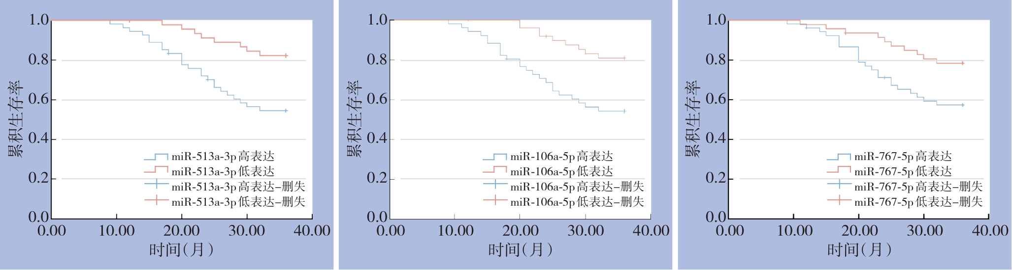摘要:背景与目的 乳腺癌预后差,缺乏稳定的分子标志物。本研究旨在探讨血清miR-513a-3p、miR-106a-5p和miR-767-5p在乳腺癌患者中的表达水平及其临床意义。方法 纳入2019—2020年内蒙古自治区巴彦淖尔市医院收治的乳腺癌患者100例(乳腺癌组)及乳腺良性疾病患者113例(良性组)。采用qRT-PCR检测血清miR-513a-3p、miR-106a-5p和miR-767-5p水平,分析三者在两组患者间的表达差异,以及与乳腺癌病理特征及3年预后的关系。采用Kaplan-Meier方法评估生存情况,通过Cox回归分析确定预后因素。结果 乳腺癌组患者血清miR-513a-3p、miR-106a-5p和miR-767-5p水平均明显高于良性组患者(均P<0.05)。三者水平均与淋巴结转移、TNM分期有关,miR-513a-3p和miR-767-5p与乳腺癌患者肿瘤分化程度有关,miR-513a-3p和miR-106a-5p还与远处转移有关(均P<0.05)。乳腺癌患者中,死亡组三者水平均明显高于生存组(均P<0.05);Kaplan-Meier分析显示,三者高表达患者3年生存率均明显低于各自的低表达患者(均P<0.05)。Cox回归提示,miR-513a-3p(OR=1.160)、miR-106a-5p(OR=1.419)及miR-767-5p(OR=1.327)均为独立预后危险因素(均P<0.05)。结论 miR-513a-3p、miR-106a-5p和miR-767-5p在乳腺癌患者血清中高表达,且与病理特征及预后密切相关,具有作为潜在预后标志物和治疗靶点的价值。