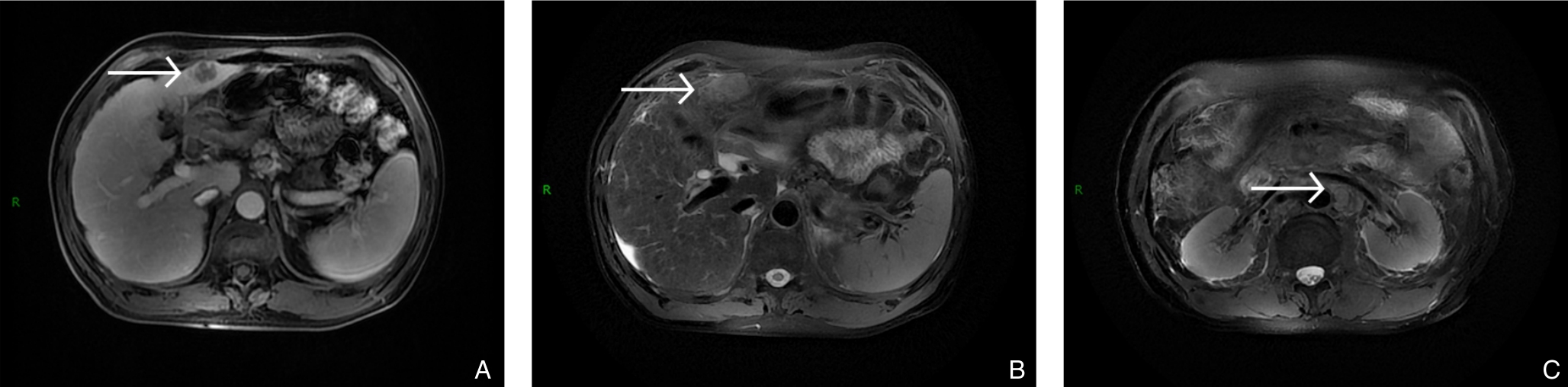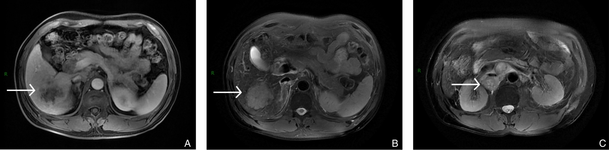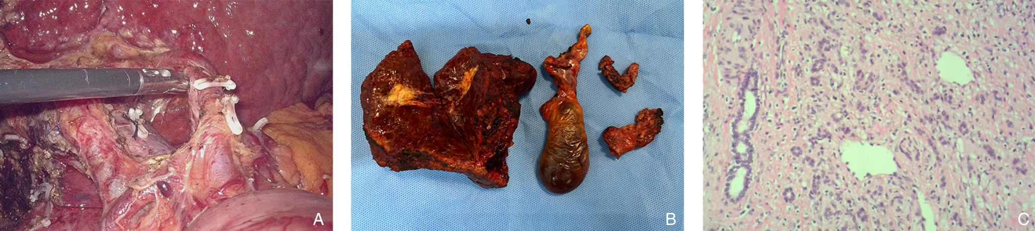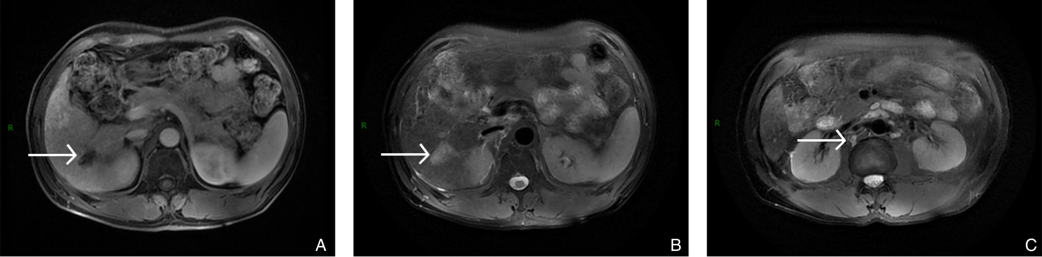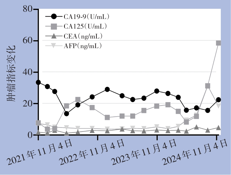 摘要:背景与目的 肝内胆管癌(ICC)是一种起病隐匿、预后极差、初诊多为进展期的原发性肝癌,其治疗选择有限,预后差。本研究旨在探讨靶向治疗、免疫治疗与肝动脉灌注化疗(HAIC)联合应用于晚期ICC的转化治疗的潜力,为临床转化治疗提供参考。方法 回顾广东医科大学附属医院2021年11月收治的1例晚期ICC行靶向治疗、免疫治疗与HAIC联合治疗后成功转化并接受手术患者的诊治过程,并复习国内外相关文献。结果 患者为52岁男性,确诊为T2N1M0-Ⅲb期ICC。患者拒绝接受以吉西他滨联合顺铂为主的一线化疗方案,同意行靶向治疗联合免疫治疗与HAIC的综合治疗,在接受4个治疗周期后评估肿瘤达到部分缓解,具备实施根治性手术治疗的条件。患者随后接受了腹腔镜下肝S6段和部分S7段切除、胆囊切除以及肝门部和腹膜后淋巴结清扫术。术后患者规律行靶向免疫联合化疗的综合治疗方案。在疾病出现复发和转移后,化疗药物进行了相应调整。截至目前,患者无病生存期达15个月,总生存期超过3年。结论 靶向治疗、免疫治疗与HAIC三联方案可提高晚期ICC患者的转化机会并延长生存期,具有较好的安全性和临床应用前景,但其疗效仍需多中心研究进一步验证。
