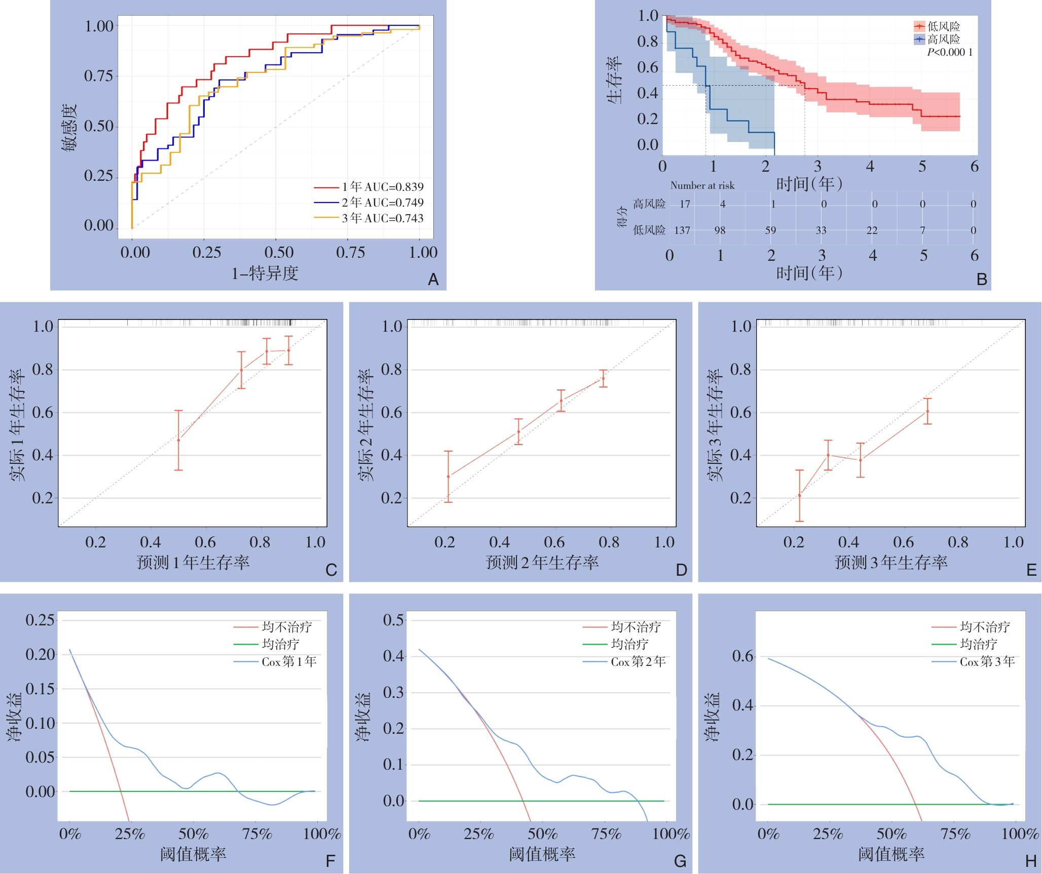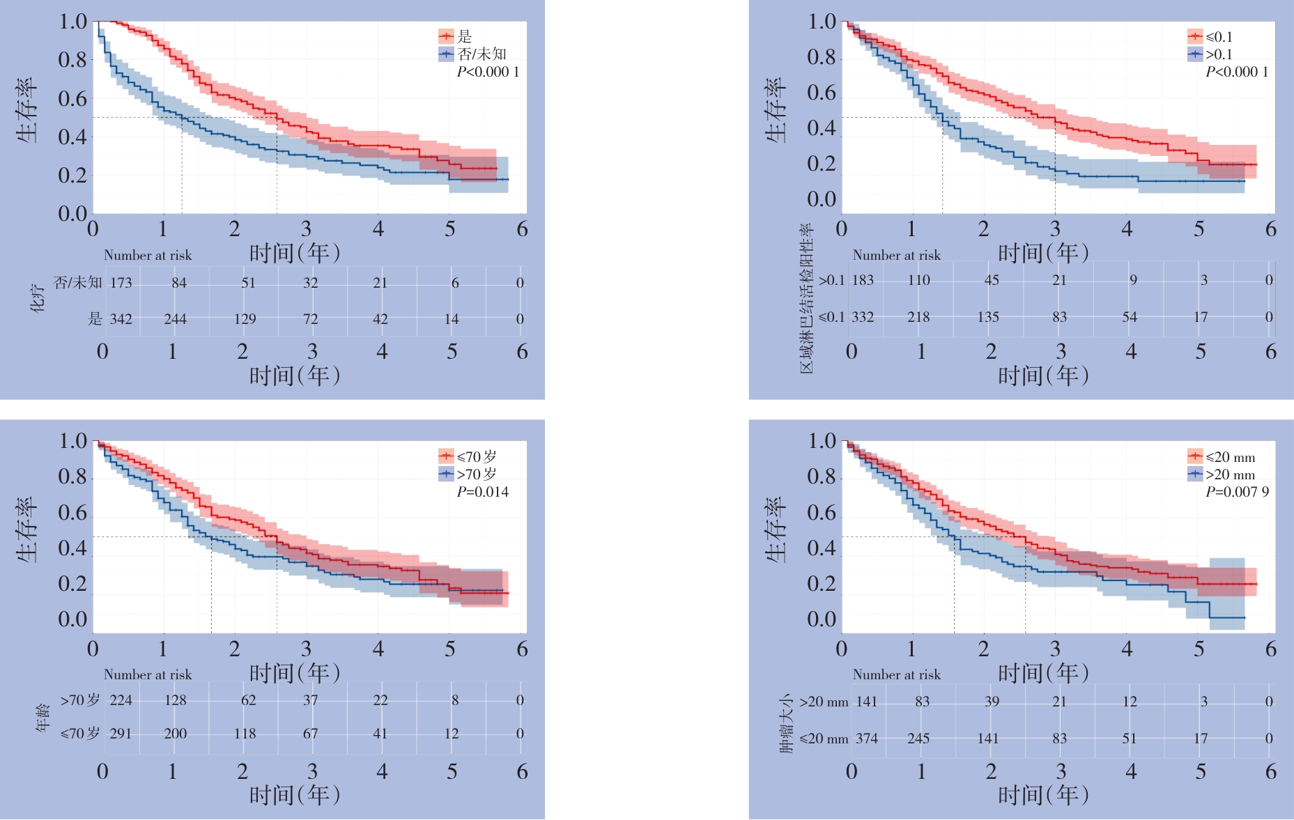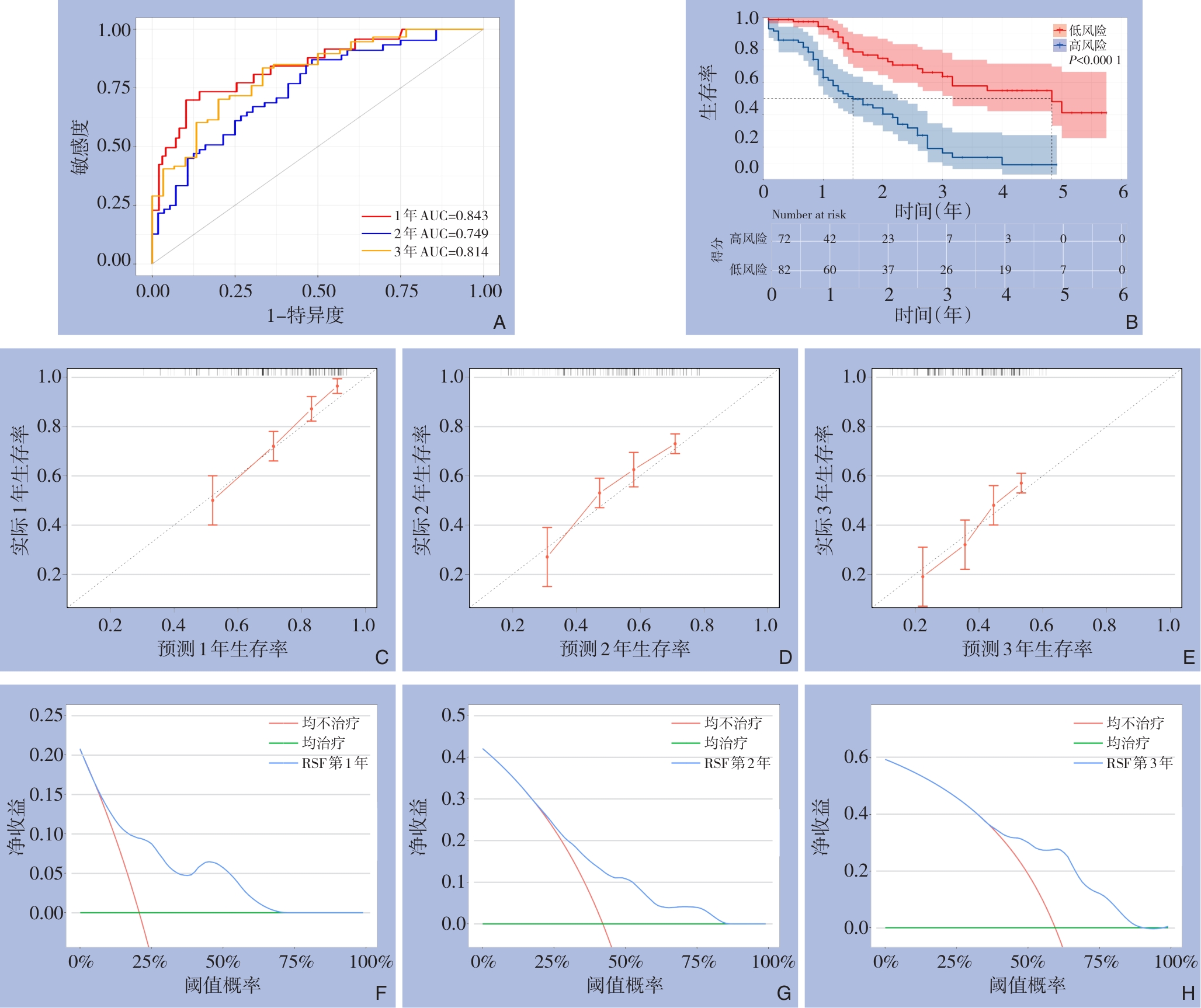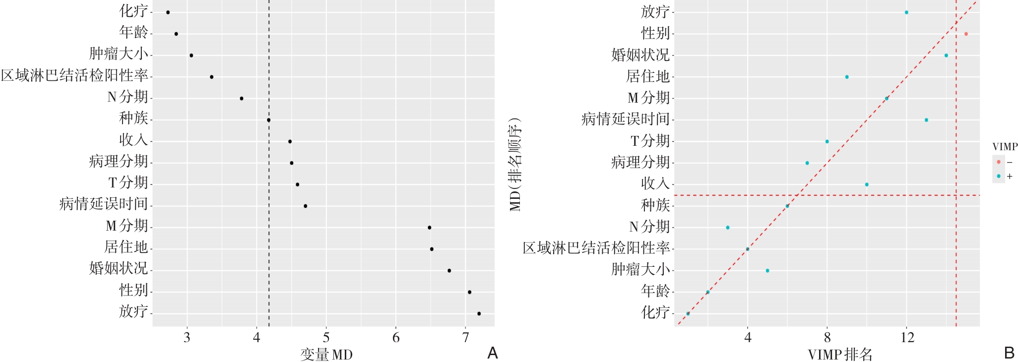 摘要:背景与目的 肝外胆管癌(ECCA)是一类起病隐匿、侵袭性强且预后较差的恶性肿瘤,其术后复发率高,5年生存率不足20%。现有多数预后模型基于Cox比例风险模型,受比例风险假设及线性关系限制。随机生存森林(RSF)模型作为一种新型机器学习算法,能够捕捉变量间复杂的交互和非线性效应,但在ECCA领域的应用仍较少。因此,本研究基于RSF模型这一机器学习算法,构建根治术后ECCA患者预后模型,旨在精准化、个体化评价根治术后ECCA患者的预后,为临床决策制定提供参考。方法 回顾性纳入2016—2021年SEER数据库中符合纳入标准的根治术后ECCA患者515例,按7∶3比例随机分为训练集(361例)和测试集(154例)。收集人口学及临床特征,采用单、多因素Cox回归构建Cox模型,并通过VIMP法与最小深度法筛选变量建立RSF模型。通过一致性指数(C指数)、曲线下面积(AUC)、Brier评分、校准曲线及决策曲线评估模型性能,并结合Kaplan-Meier生存分析及可解释性工具(SurvSHAP与SurvLIME)进行解释。结果 多因素Cox回归筛选出年龄、人种、收入、T分期、N分期、肿瘤大小及化疗7个独立预后因素。RSF模型则筛选出年龄、肿瘤大小、区域淋巴结阳性率和化疗4个核心变量。测试集中,RSF模型的C指数为0.751,优于Cox模型的0.711;RSF模型1、2、3年AUC分别为0.843、0.749和0.814,整体性能更佳,校准度与临床获益也优于Cox模型。进一步分析显示,区域淋巴结阳性率、年龄及肿瘤大小与生存风险呈非线性关系,化疗则显著降低死亡风险。分层生存曲线提示,不化疗、淋巴结阳性率高、年龄>70岁及肿瘤大小>20 mm患者预后更差。结论 基于RSF的预后模型仅依赖4个临床可及变量,预测性能优于Cox模型,可为ECCA术后个体化生存预测及随访策略制定提供可靠依据。其结合可解释性分析,具有较强的临床应用潜力,有望改善患者生存质量与预后。
