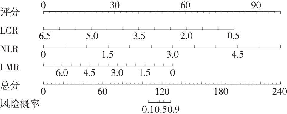 摘要:背景与目的 胆囊癌根治性切除术后复发率高,严重影响患者长期生存。现有的TNM分期和病理指标预测效能有限,难以满足个体化风险评估需求。本研究旨在探讨术前淋巴细胞-C反应蛋白比值(LCR)、中性粒细胞-淋巴细胞比值(NLR)及淋巴细胞-单核细胞比值(LMR)对胆囊癌术后复发的预测价值,并构建基于三者的预测模型。方法 回顾性分析河南省新乡市第二人民医院2012年1月—2019年1月接受胆囊癌根治性切除术的80例患者临床资料。根据复发情况分为复发组(38例)和未复发组(42例)。比较两组术前LCR、NLR、LMR水平,采用多因素Logistic回归分析独立危险因素,受试者工作特征(ROC)曲线评价预测效能,并基于危险因素构建列线图模型,使用ROC、校准曲线及决策曲线进行验证。结果 复发组患者LCR、LMR明显低于未复发组,而NLR明显升高(均P<0.05)。多因素分析显示,LCR、NLR、LMR均为复发独立影响因素(均P<0.05)。ROC分析显示,LCR、NLR、LMR预测复发的曲线下面积(AUC)分别为0.935、0.890、0.916,联合检测AUC为0.989,预测效能最佳。基于三者建立的列线图模型一致性指数为0.989,预测复发的AUC为0.992,校准曲线和Hosmer-Lemeshow检验均显示良好拟合度,决策曲线提示模型具有较高临床净获益。结论 术前LCR、NLR及LMR均可作为胆囊癌根治性切除术后复发的独立预测指标,三者联合检测较单一指标更具优势。基于其构建的列线图模型具有良好的预测准确性和临床实用性,可为患者的个体化随访与辅助治疗提供参考。