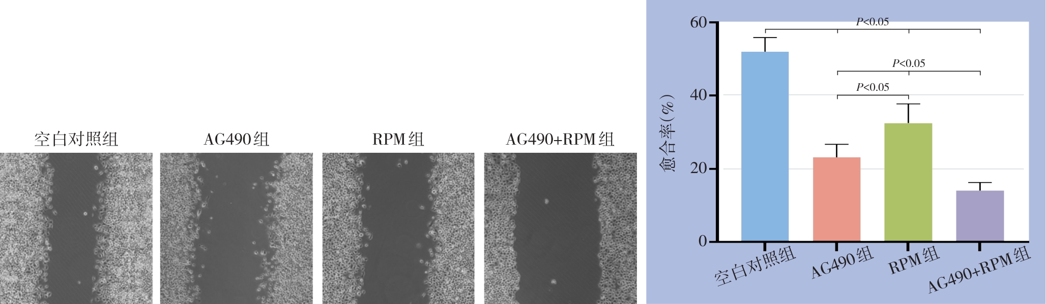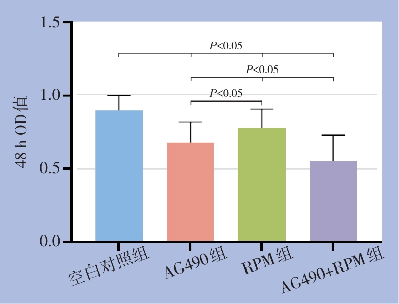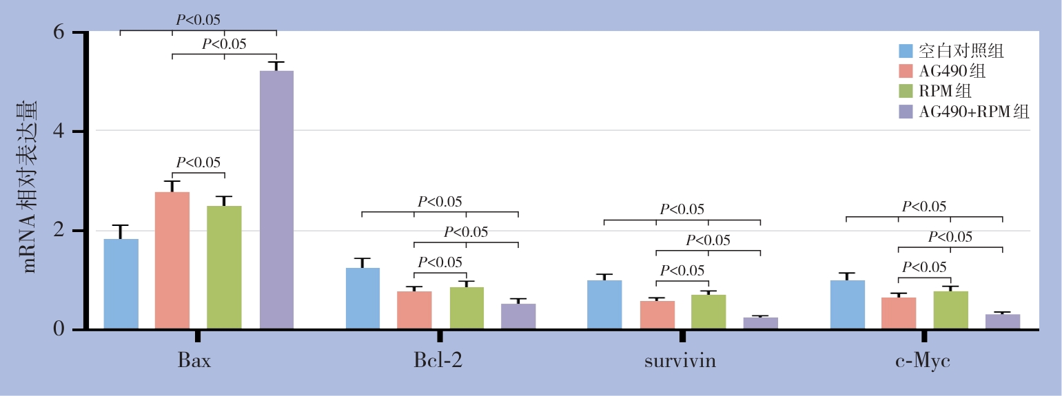 摘要:背景与目的 肝细胞癌(HCC)是常见的恶性肿瘤之一,发病率和病死率均居高不下。Janus激酶/信号转导与转录激活因子(JAK/STAT)信号通路在调控细胞增殖、凋亡及免疫应答中发挥重要作用,其持续激活与肝癌的发生发展密切相关。本研究旨在探讨JAK2抑制剂AG490与STAT3通路相关抑制剂雷帕霉素(RPM)对肝癌细胞生物学行为的影响及其分子机制。方法 采用人肝癌细胞系HepG2,分为空白对照组、AG490组、RPM组和AG490+RPM组。通过MTT法、划痕实验和流式细胞术分别检测细胞的增殖、迁移和凋亡;利用ELISA和qRT-PCR检测Bax、Bcl-2、caspase-3、survivin和c-Myc的蛋白及mRNA表达;Western blot检测JAK2、STAT3及其磷酸化水平。结果 与对照组比较,AG490组、RPM组和AG490+RPM组的肝癌细胞的增殖和迁移能力均被明显抑制,细胞凋亡明显增加,其中AG490+RPM组作用最为明显(均P<0.05)。各抑制剂处理组均表现为Bax和caspase-3表达升高,Bcl-2、survivin和c-Myc表达下降,且AG490+RPM组变化幅度最大(均P<0.05)。同时,p-JAK2/JAK2和p-STAT3/STAT3比值在各抑制剂处理组均明显降低,以AG490+RPM组最低(均P<0.05)。结论 靶向JAK/STAT通路的抑制剂能够显著抑制肝癌细胞的增殖和迁移,并诱导细胞凋亡,其机制可能与下调p-JAK2和p-STAT3水平、调控相关凋亡和增殖基因表达有关。AG490与RPM联合应用显示出更强的抗肿瘤作用,提示多靶点联合阻断JAK/STAT通路有望成为肝癌治疗的新策略。