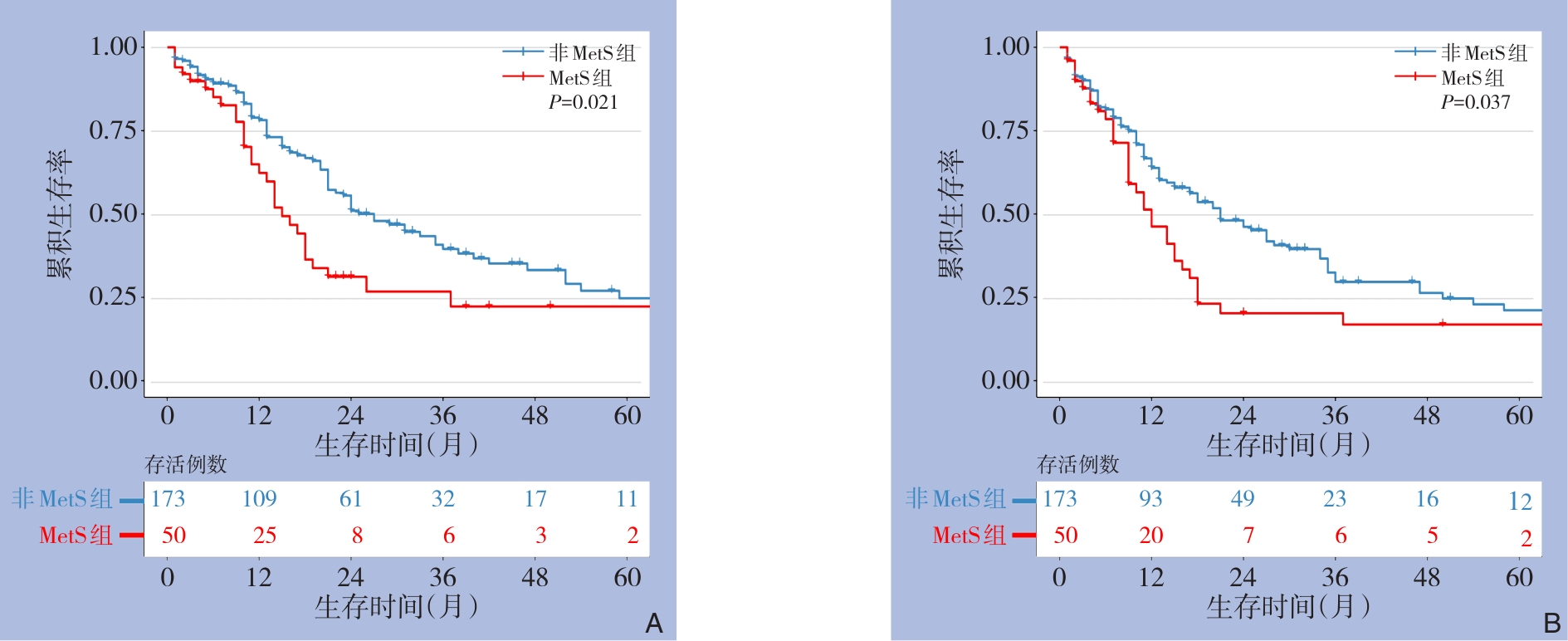 摘要:背景与目的 肝门部胆管癌(pCCA)预后较差,根治性切除虽是主要治疗手段,但术后复发率高、总生存(OS)率低。代谢综合征(MetS)已被证实与多种肿瘤不良预后相关,其对pCCA术后结局的影响尚不明确。本研究旨在评估MetS对pCCA患者根治性切除术后围手术期及远期预后的影响。方法 回顾性分析2018年1月—2023年12月在中国人民解放军陆军军医大学第一附属医院接受根治性切除的223例pCCA患者,根据MetS诊断标准分为MetS组(50例)和非MetS组(173例)。比较两组的围手术期并发症、OS、无复发生存期(RFS),并通过多因素分析探讨预后相关因素。结果 两组在中位住院时间、总并发症和严重并发症发生率上差异均无统计学意义(均P>0.05)。MetS组1、3、5年OS率分别为62.3%、22.3%、0,RFS率分别为46.2%、16.9%、0;非MetS组1、3、5年OS率为78.2%、39.5%、22.0%,RFS率为63.8%、29.6%、18.8%。MetS组的中位OS和RFS(15.0和12.0个月)均明显低于非MetS组(27.0和21.0个月)(P=0.021;P=0.037)。多因素分析显示,MetS和大血管侵犯是OS的独立影响因素;MetS、黄疸、R0切除及大血管侵犯是RFS的独立影响因素(均P<0.05)。结论 MetS与pCCA患者根治性切除术后更差的远期生存及更高的复发风险显著相关,提示应将MetS纳入术前评估和术后管理,以改善预后。