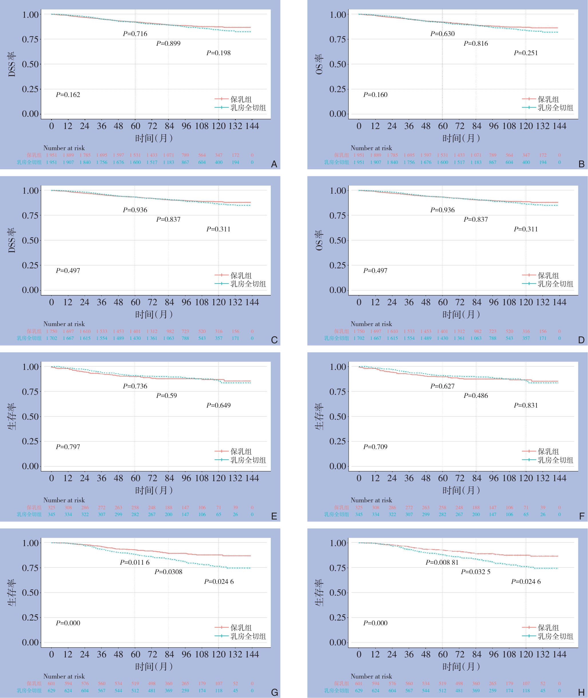 摘要:背景与目的 中央区乳腺癌(CLBC)因其靠近乳头乳晕复合体,长期以来多推荐全乳切除术,保乳手术(BCS)的安全性存在争议。本研究基于大规模数据库并结合真实世界队列,对比分析BCS与全乳切除术的生存结局,旨在评估BCS在CLBC患者中的可行性与肿瘤学安全性。方法 利用SEER数据库(2010—2015年),纳入10 325例CLBC女性患者,分为BCS组(n=5 601)和全乳切除组(n=4 724)。通过倾向性评分匹配(PSM)获得1 951对患者,比较两组的疾病特异性生存(DSS)和总生存(OS)。进一步采用Cox回归分析预后因素,并行亚组分析。另在中南大学湘雅医院(2015—2016年)收集221例BCS和636例全乳切除患者作为验证队列,比较OS与无进展生存(PFS)。结果 PSM后两组基线特征均衡。Kaplan-Meier分析显示,BCS组与全乳切除组在DSS和OS上无明显差异,5、7、10年OS率亦相当(均P>0.05)。亚组分析显示,在T1/T2期、不同HER2状态及接受化疗的患者中,BCS与全乳切除术结局相当;在接受放疗的患者中,BCS组DSS和OS均明显优于全乳切除组(均P<0.05)。多因素Cox回归提示T分期、N分期、M分期、组织学分级、分子亚型、ER/PR状态及化疗是独立预后因素(均P<0.05),而手术方式并非影响因素(P>0.05)。验证队列结果与SEER数据库一致,BCS与全乳切除组在OS和PFS方面差异均无统计学意义(均P>0.05)。结论 BCS在CLBC患者中的DSS和OS与全乳切除术相当,且在放疗配合下可能带来额外生存获益。结果表明CLBC不应视为保乳禁忌证,BCS可作为可行且安全的手术策略,为临床个体化治疗决策提供重要依据,并有助于改善患者生活质量。