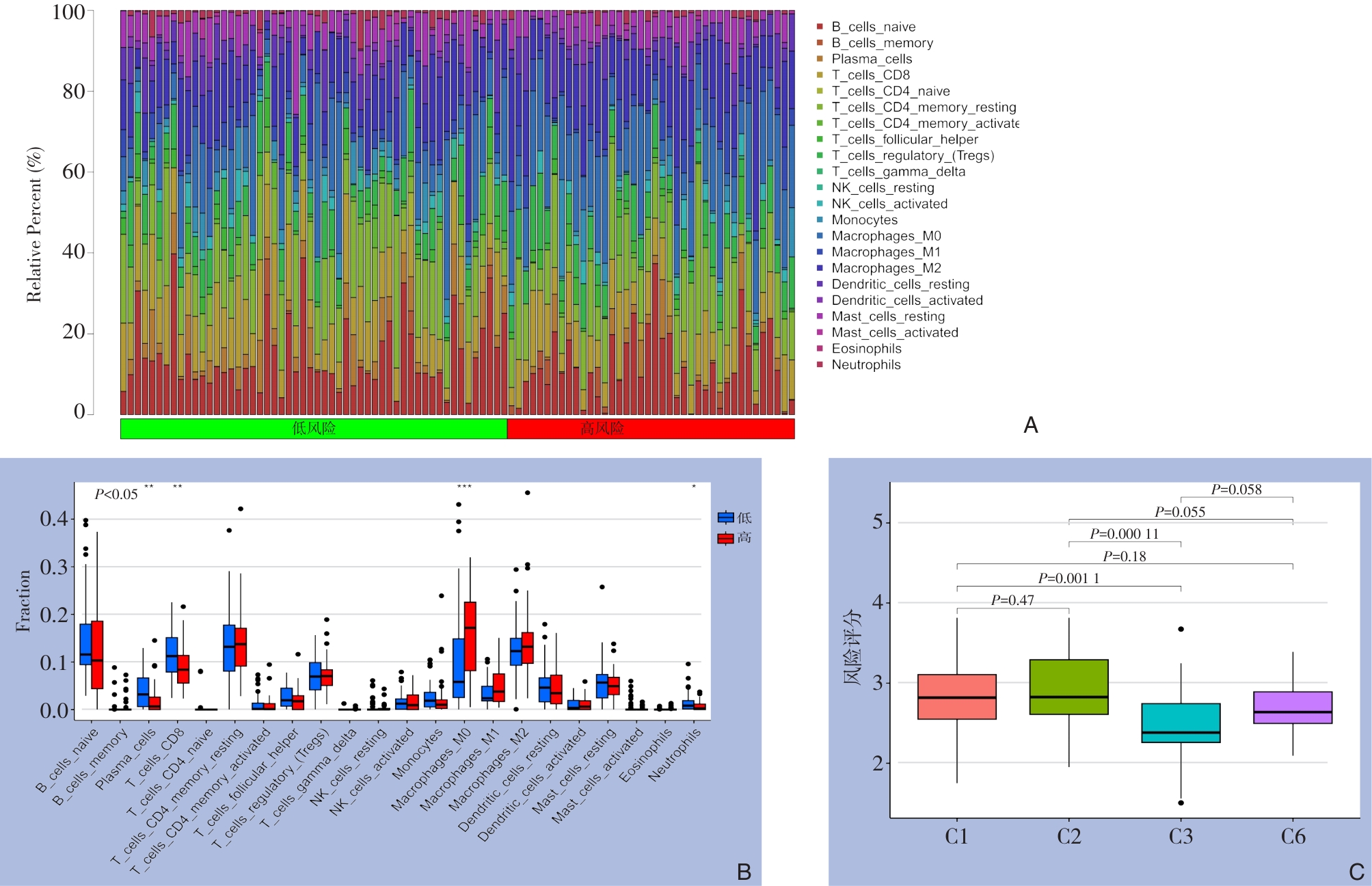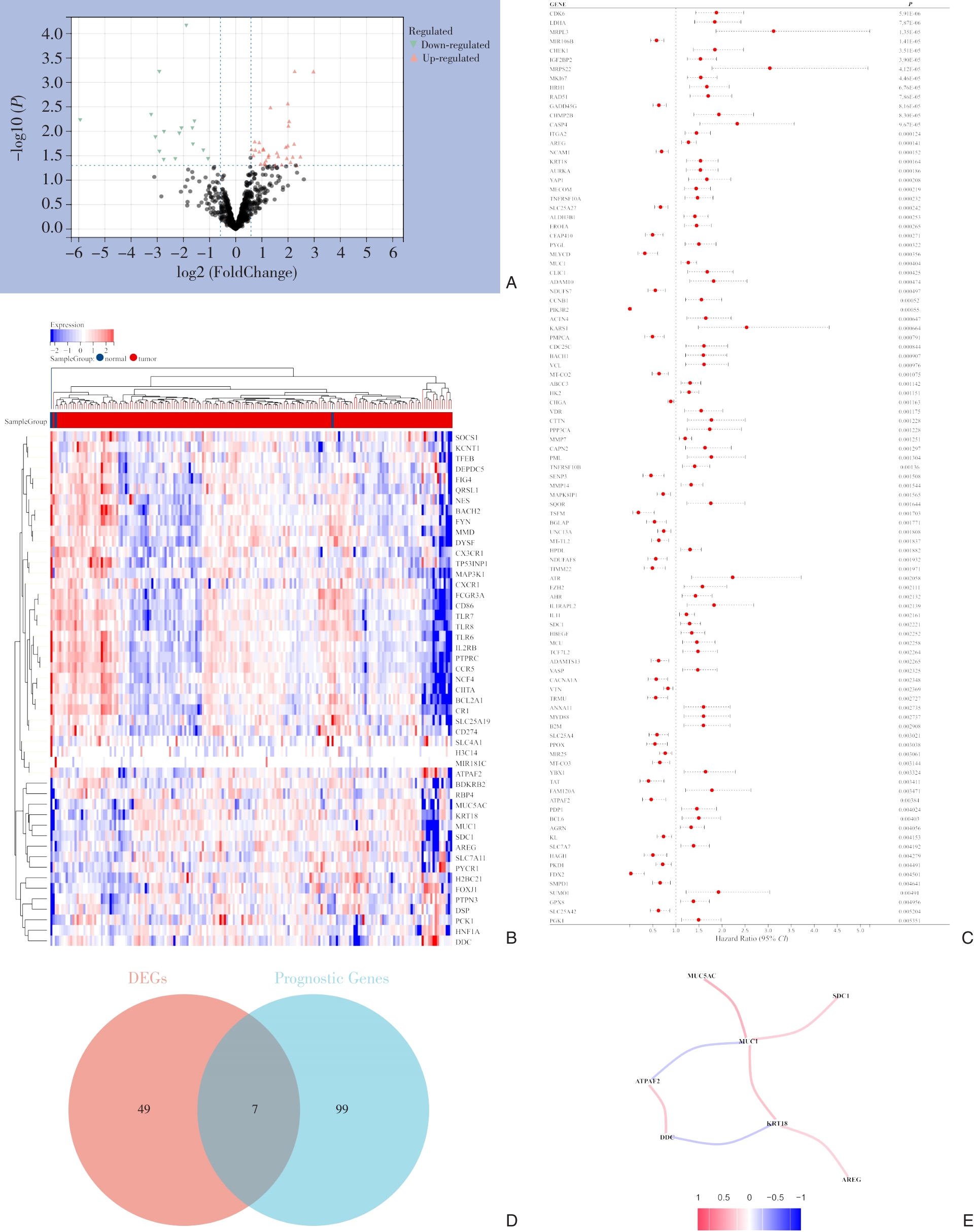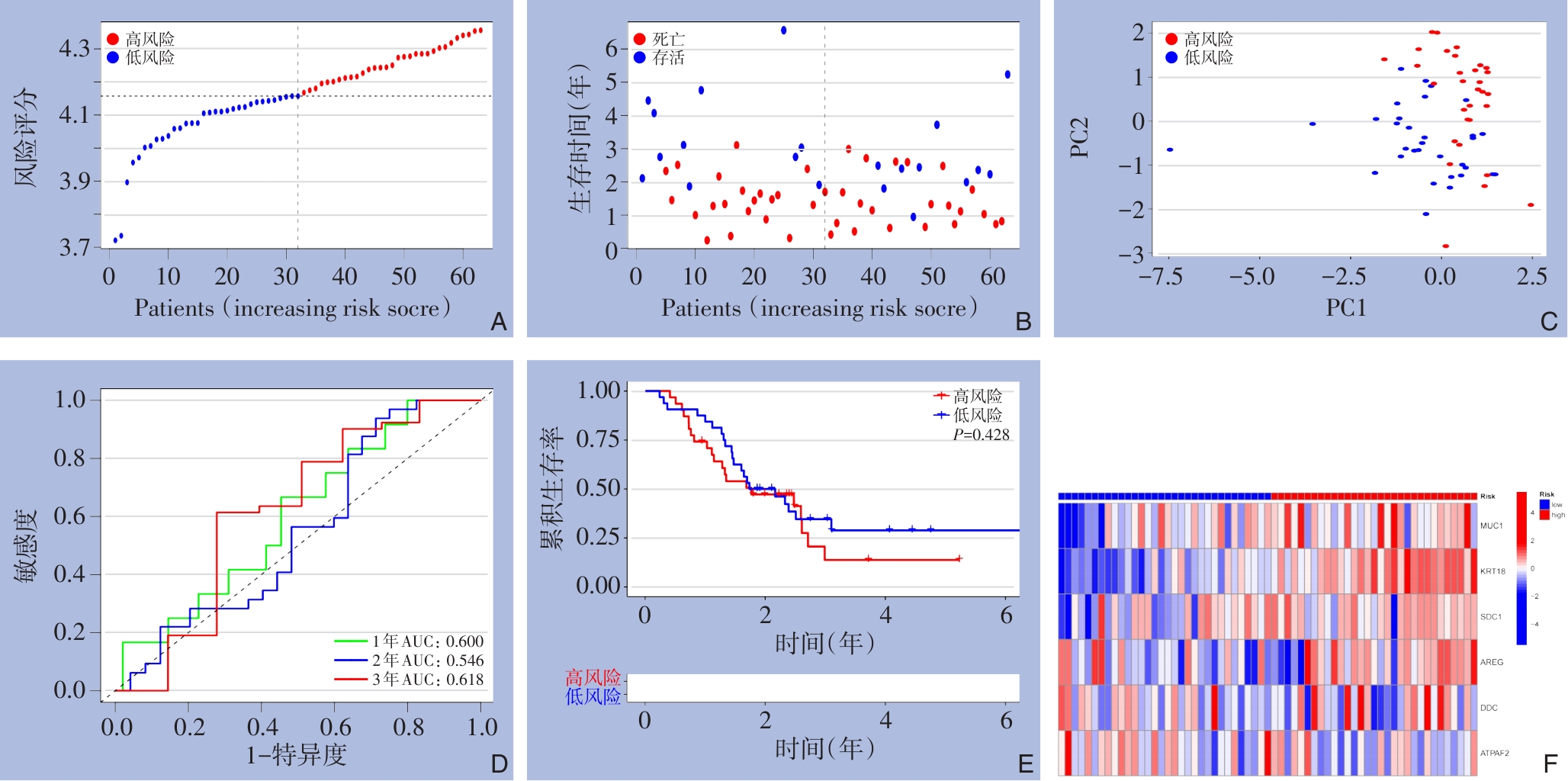 摘要:背景与目的 胰腺癌是一种恶性程度极高、预后极差的消化系统肿瘤,其复杂的肿瘤微环境在疾病进展中发挥重要作用。氧化应激与乳酸代谢是影响肿瘤发生、发展及免疫逃逸的关键生物过程,二者在胰腺癌预后中的协同效应尚不明确。本研究旨在整合氧化应激和乳酸代谢相关基因,构建并验证一个具有临床价值的胰腺癌预后模型,为揭示其潜在的分子机制提供依据。方法 从肿瘤基因组图谱数据库获取177例胰腺癌患者的转录组测序数据和临床资料,并结合基因表达全景图谱(GEO)数据库(GSE57495)进行外部验证。通过“limma”R包筛选胰腺癌中氧化应激与乳酸代谢相关的差异表达基因,采用单变量Cox回归分析筛选预后相关基因,进一步经LASSO回归建立多基因风险评分模型。利用Kaplan-Meier生存曲线、受试者工作特征(ROC)曲线、一致性指数(C指数)、列线图及决策曲线评估模型的预测能力和临床应用价值。最后,运用CIBERSORT算法和ssGSEA分析不同风险组间免疫细胞浸润差异及免疫状态特征。结果 最终筛选出6个关键基因(MUC1、KRT18、SDC1、AREG、DDC、ATPAF2)构建胰腺癌预后模型。根据模型计算的风险评分,患者被划分为高、低风险组。Kaplan-Meier分析显示高风险组患者总生存率明显低于低风险组(P<0.01)。ROC曲线分析显示该模型在1、2、3年预测中的曲线下面积分别为0.710、0.674、0.649,C指数和列线图验证均表明模型具有良好的区分性与校准性。多因素Cox分析提示风险评分是胰腺癌的独立预后因素。外部GEO数据集验证了模型的稳健性。免疫浸润分析显示,高风险组中M0型巨噬细胞比例明显增加,而效应T细胞及CD8+ T细胞浸润减少,提示免疫抑制性微环境可能与预后不良相关。结论 本研究构建了一个基于氧化应激与乳酸代谢相关基因的胰腺癌预后预测模型,能够独立预测患者生存,并揭示不同风险组的免疫微环境差异。该模型为胰腺癌的预后评估、分层管理及个体化治疗策略的制定提供了新的分子依据与潜在靶点。