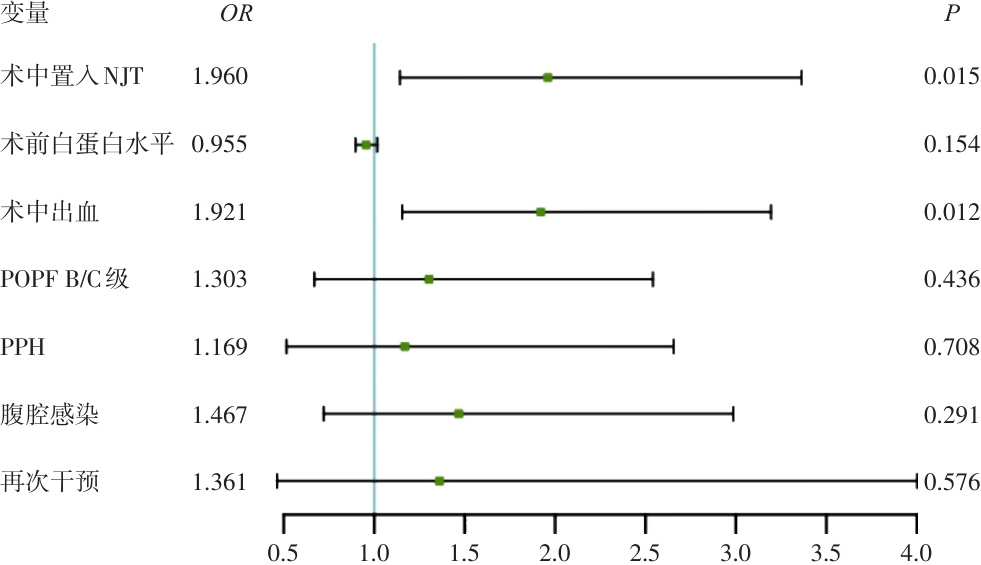 摘要:背景与目的 腹腔镜胰十二指肠切除术(LPD)是治疗壶腹部周围肿瘤的重要手术方式,但术后胃排空延迟(DGE)仍较为常见,严重影响患者恢复。鼻空肠管(NJT)常用于术后早期肠内营养支持,但其对DGE的影响尚存争议。本研究旨在探讨术中置入NJT与LPD术后DGE发生的相关性,并评估其对术后恢复及预后的影响。方法 回顾性分析2017年4月—2023年11月于山东第一医科大学附属省立医院接受LPD的319例患者的病历资料,按术中是否放置NJT分为NJT组(n=200)与无NJT组(n=119)。比较两组DGE发生率及术后恢复指标差异。采用多因素Logistic回归及倾向性评分匹配(PSM)分析,验证NJT置入是否为DGE的独立危险因素。结果 NJT组B、C级DGE发生率明显高于无NJT组(36.5% vs. 21.8%,P=0.006),术后住院时间和住院费用亦明显增加(均P<0.05)。多因素分析显示,术中置入NJT(OR=1.960,95% CI=1.142~3.363,P=0.015)及术中出血量>400 mL(OR=1.921,95% CI=1.155~3.194,P=0.012)为DGE的独立危险因素。PSM后结果仍保持一致。结论 术中预防性放置NJT不仅不能改善患者术后恢复,反而显著增加DGE风险并延长住院时间、增加医疗费用。临床上应避免常规放置NJT,而应依据患者具体情况进行个体化决策,以减少术后并发症并优化恢复过程。