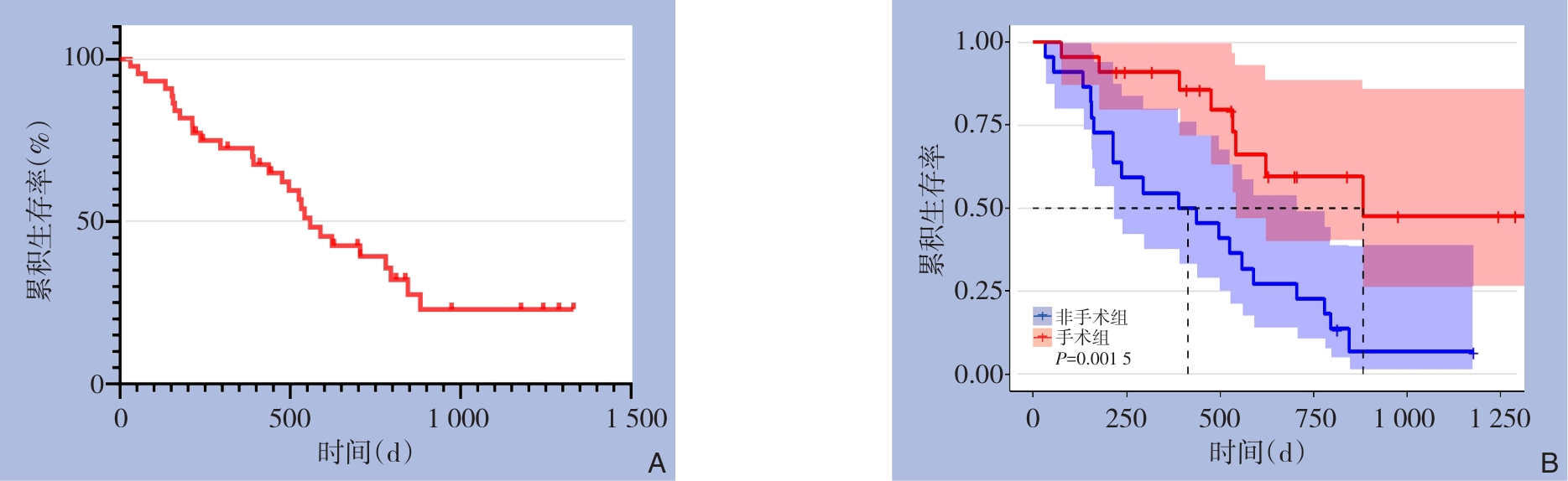 摘要:背景与目的 胰腺癌是一种恶性程度极高、预后极差的消化系统肿瘤。近年来其发病呈年轻化趋势,早发性胰腺癌(EOPC,诊断年龄≤50岁)比例逐年上升,可能具有独特的生物学行为和预后特征。国内针对EOPC的系统研究较少,因此本研究探讨EOPC患者的临床病理特征及其预后。方法 回顾性分析2017年1月─2023年12月中南大学湘雅医院收治的113例EOPC患者的临床资料,包括一般资料、临床病理特征及预后信息。采用Kaplan-Meier法绘制生存曲线,并比较手术组与非手术组的生存差异。结果 113例EOPC患者中位年龄为46(42~49)岁,男性占65.49%。A型及O型血型占比最高(40.71%和34.51%)。主要临床症状为腹痛(69.91%)、体质量下降(62.83%)、黄疸(43.36%)和腹胀(36.28%)。影像学显示胆管扩张32.74%,主胰管扩张39.82%,血管侵犯59.29%,远处转移52.21%。病理结果显示腺癌及导管腺癌占93.81%,以中、低分化为主(共76.10%),胰头部发病最常见(65.42%)。TNM分期显示,淋巴结转移率高达77.88%,临床Ⅳ期占52.21%。实验室检查中CA19-9显著升高。Kaplan-Meier分析显示,全队列中位总生存期为18.6个月;手术组明显优于非手术组(29.4个月vs. 13.8个月,P=0.001 5)。结论