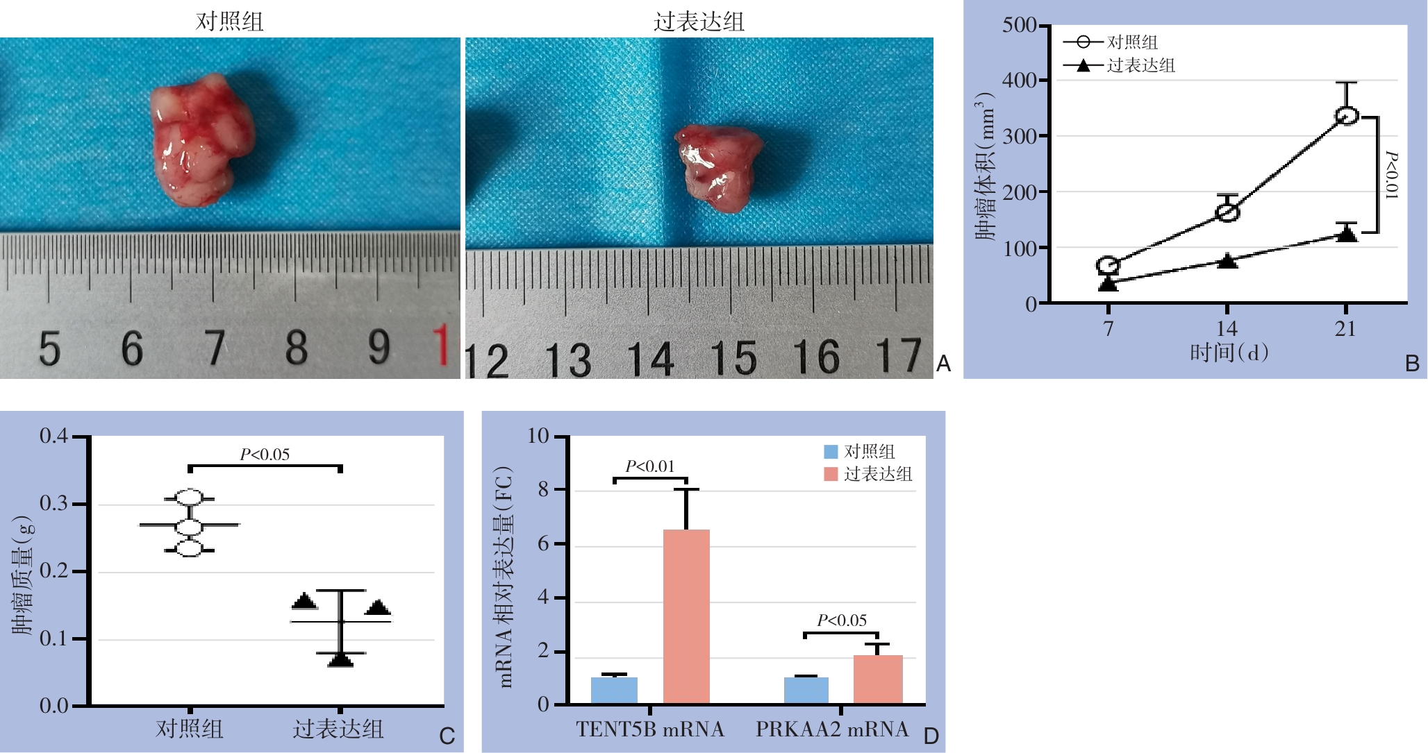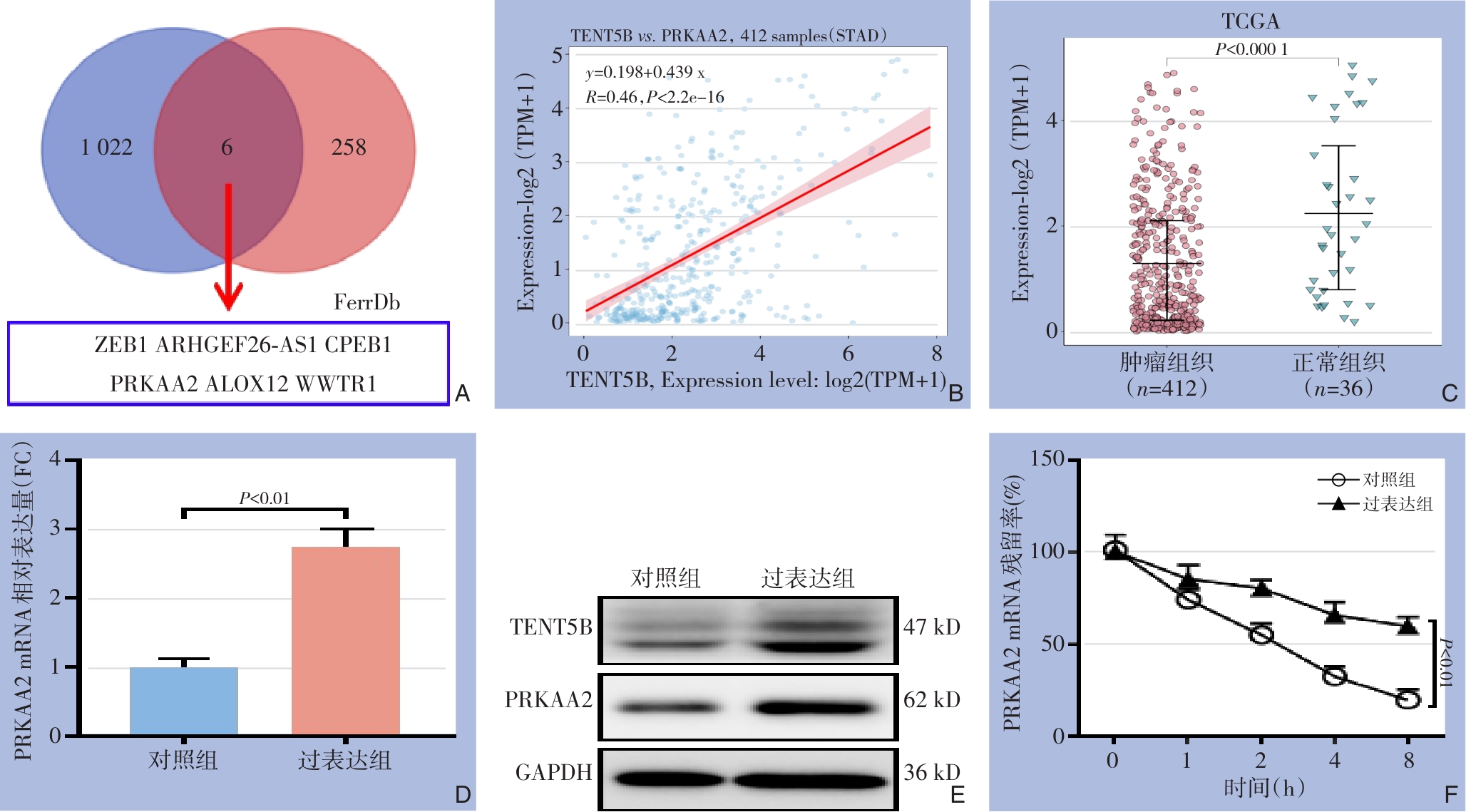 摘要:背景与目的 胃癌是全球高发且预后不良的恶性肿瘤,现有治疗手段疗效有限。铁死亡作为一种新型细胞死亡方式,在肿瘤治疗中具有重要潜力。末端核苷酸转移酶5B(TENT5B)在多种肿瘤中低表达,但其在胃癌中的作用尚未明确。本研究旨在探讨TENT5B在胃癌中的表达特征及其通过调控铁死亡抑制肿瘤进展的机制。方法 通过TCGA和GEO数据库分析TENT5B在胃癌中的表达情况,并采用qRT-PCR和Western blot检测其在胃癌组织及细胞中的表达水平;利用CCK-8、克隆形成、划痕愈合和Transwell实验评估TENT5B过表达对胃癌细胞增殖和迁移的影响;通过细胞活力、脂质活性氧化物和丙二醛水平分析铁死亡情况;结合生物信息学、mRNA稳定性检测和功能挽救实验探讨其分子机制;并通过小鼠皮下成瘤实验验证其体内作用。结果 TENT5B在胃癌组织和细胞中明显下调。过表达TENT5B可抑制胃癌细胞增殖和迁移,并促进铁死亡。机制研究表明,TENT5B通过增强PRKAA2 mRNA稳定性上调其表达,进而介导铁死亡的发生。体内实验进一步证实TENT5B过表达可抑制肿瘤生长并提高PRKAA2水平。结论 TENT5B作为潜在的抑癌基因,可通过增强PRKAA2 mRNA稳定性促进铁死亡,从而抑制胃癌进展。本研究为胃癌铁死亡靶向治疗提供了新的分子依据和潜在治疗策略。