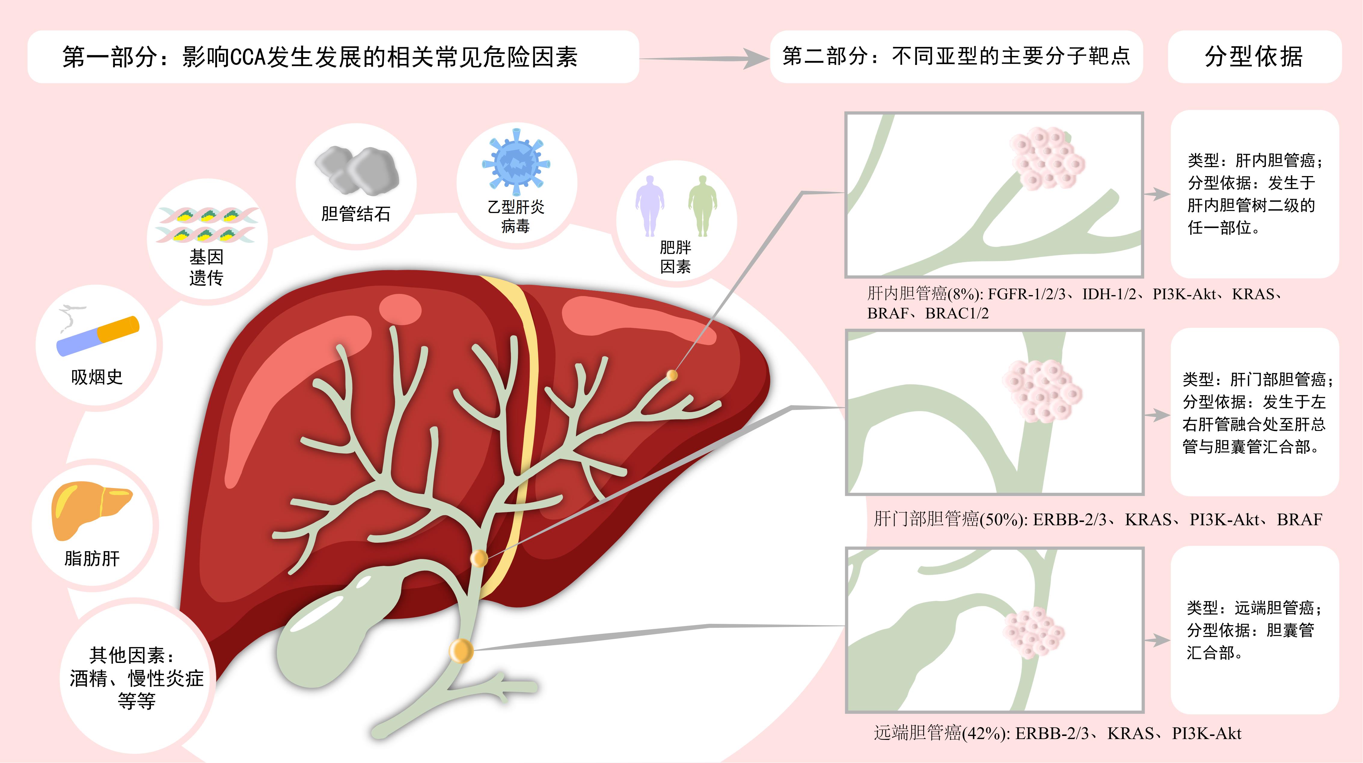 摘要:胆管癌(CCA)是一种起源于胆管上皮细胞的恶性肿瘤,近年来在亚洲地区的发病率与病死率呈增长趋势。由于CCA早期症状隐匿且不典型,患者确诊时多为晚期,丧失手术根治的机会。虽然临床上目前一线治疗以化疗为主,但其效果并不理想。随着当下二代测序技术迅速发展以及“个体化”精准治疗理念逐渐普及,人们对于CCA的分子生物学见解愈来愈深刻,在分子靶向治疗、免疫治疗以及靶免联合治疗的研究也愈来愈深入。本文针对CCA的分子靶点、免疫微环境、免疫检查抑制点及其治疗手段等方面做一概述。