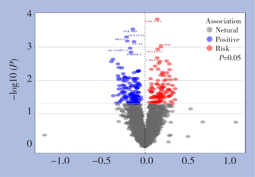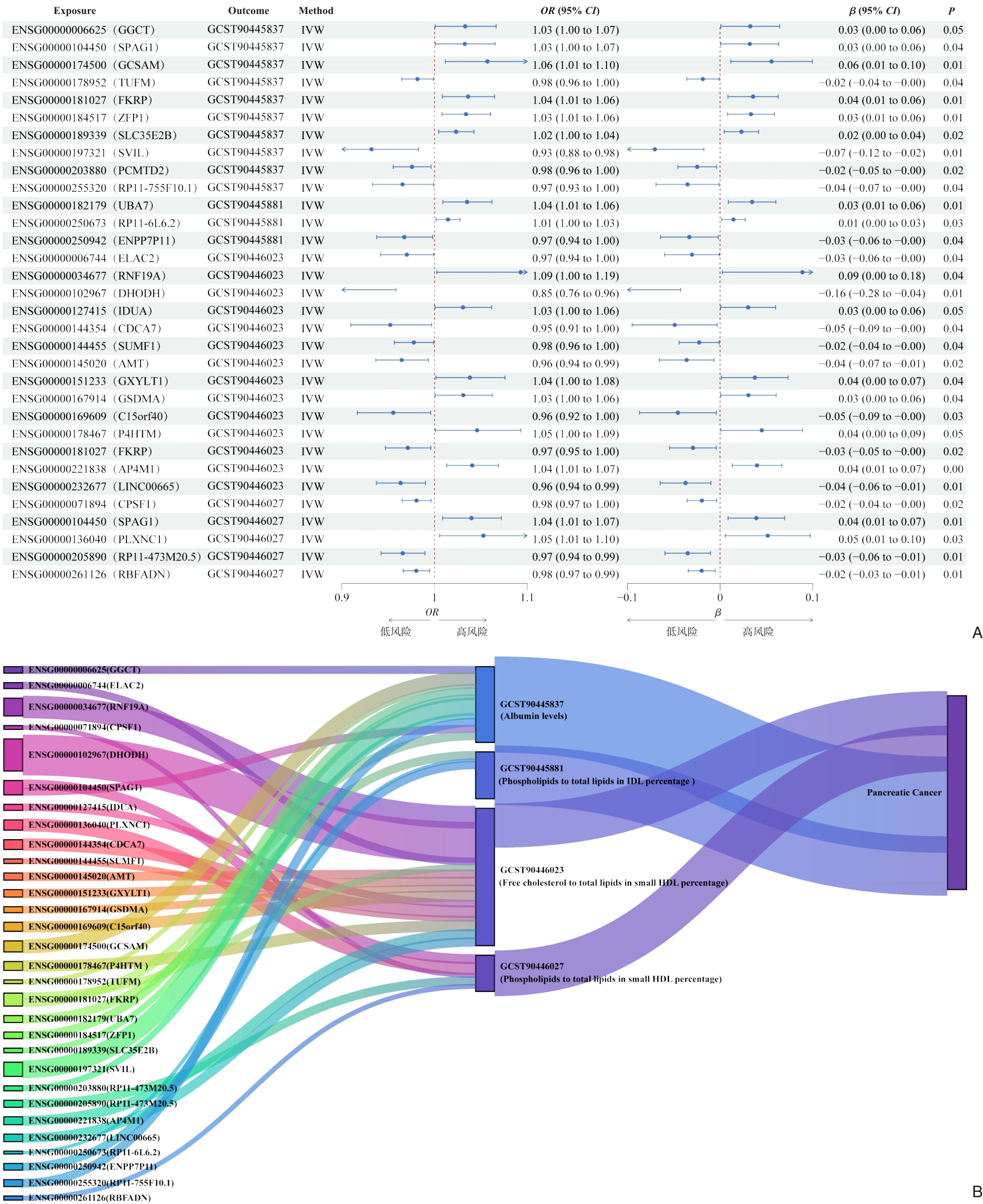 摘要:背景与目的 胰腺癌(PC)是预后极差的恶性肿瘤,早期诊断与风险预测仍面临巨大挑战。既往研究提示多种血清代谢物与PC风险相关,但因观察性研究受混杂因素影响,其因果性尚未明确。本研究基于大规模基因组数据,系统评估血清代谢物与PC风险的遗传因果关系,筛选PC风险相关基因,并构建基因-代谢物-PC的因果关联网络。方法 利用双样本孟德尔随机化(TSMR)和基于汇总数据的孟德尔随机化(SMR),分析方法,整合325种血清代谢物的GWAS数据、胰腺组织eQTL数据及FinnGen R12 PC GWAS数据,分析代谢物与PC风险的遗传因果关联,筛选PC风险基因,并进一步探讨代谢物在基因与PC风险间的潜在中介作用。结果 TSMR分析共鉴定出4种血清代谢物与PC风险存在显著因果关系。血清白蛋白水平(OR=1.456,P=0.003)及小高密度脂蛋白(HDL)中游离胆固醇比例(OR=1.189,P=0.005)升高显著增加PC风险,而中间密度脂蛋白(IDL)与小HDL中磷脂比例升高则具有保护作用(OR=0.792和0.836,均P<0.01)。SMR分析进一步识别出196个与PC风险显著相关的基因,其中包括DGKQ、CDC37P1、SULT1A2等风险基因及PALMD、HEG1等保护性基因。最终共确立32对显著的基因-代谢物因果配对,揭示特定代谢物在基因与PC风险之间可能发挥中介作用。结论 本研究系统描绘了血清代谢物与胰腺癌风险之间的因果关联及其基因调控网络,提示脂质代谢相关通路在PC发生中的核心作用。所得代谢物及基因线索为胰腺癌的早期诊断、分层筛查及个体化干预策略提供了科学依据。